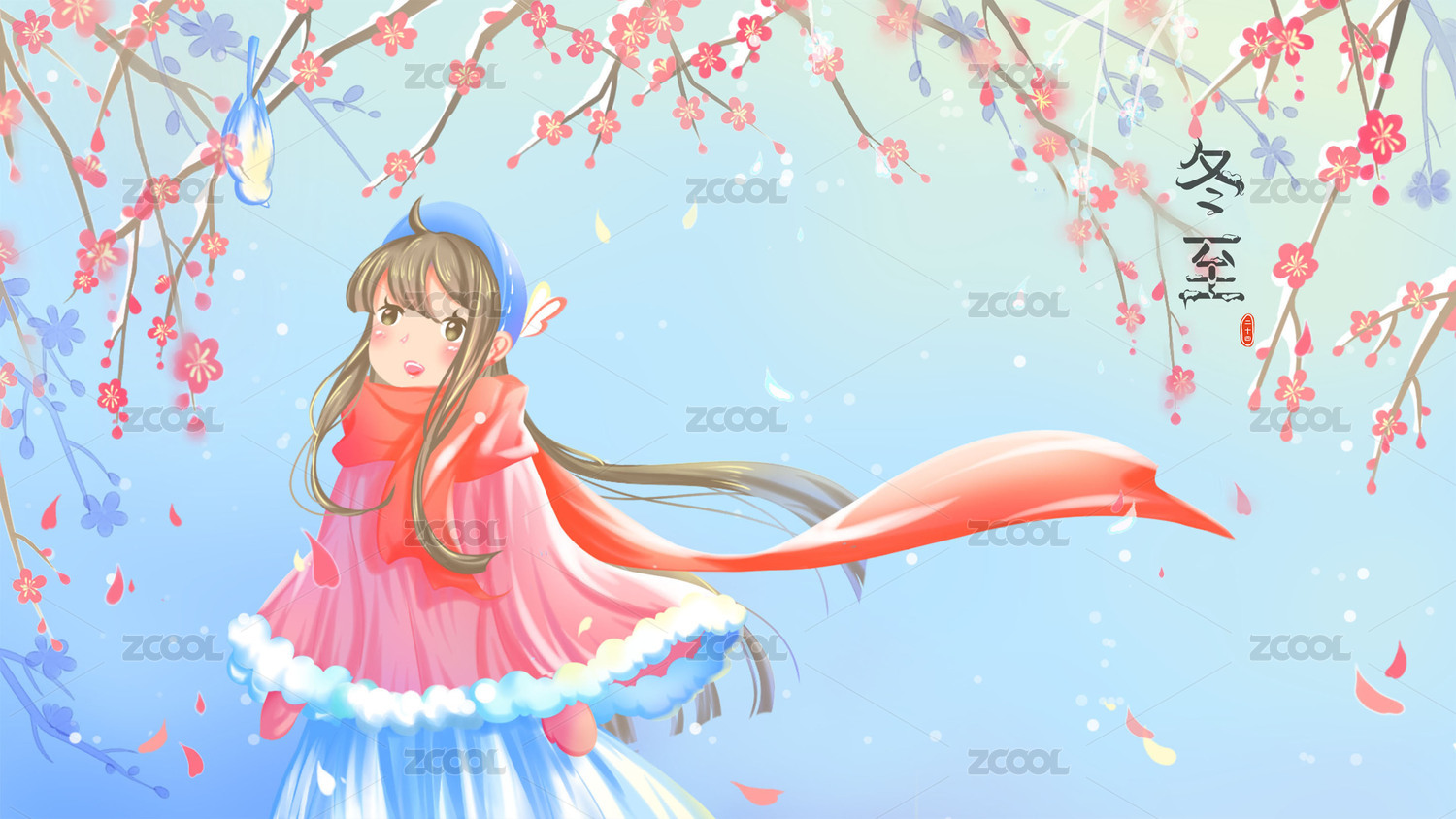 少女观赏盛开的红梅花,唯美清新冬至插画