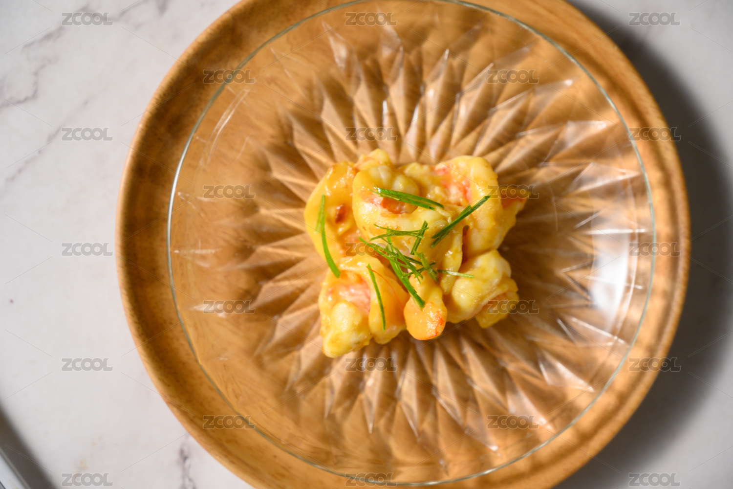 正上方视角拍摄的美食 芥末虾球