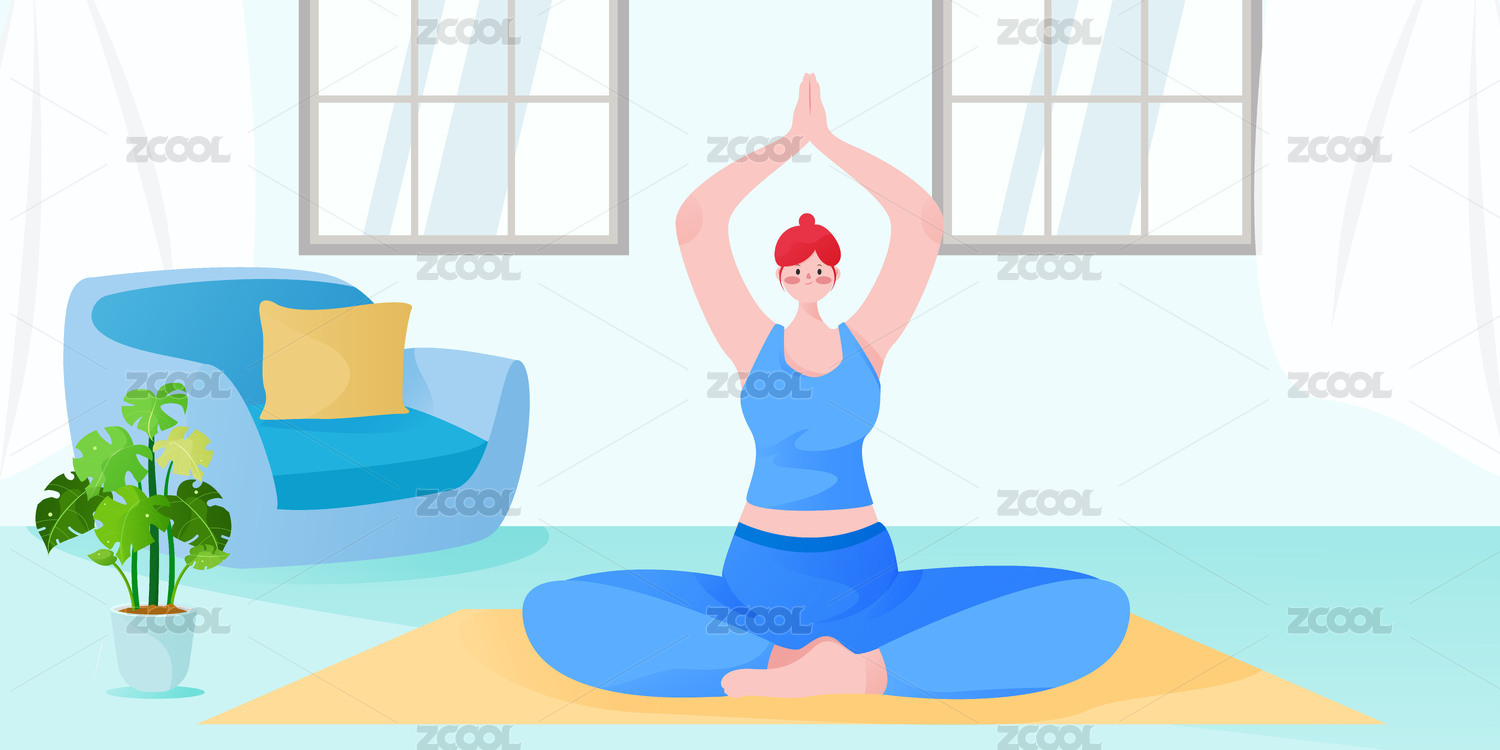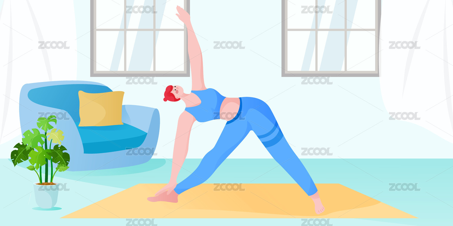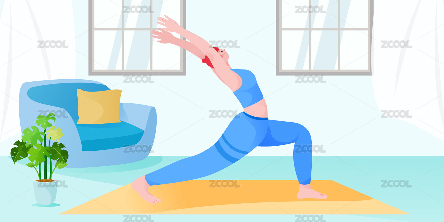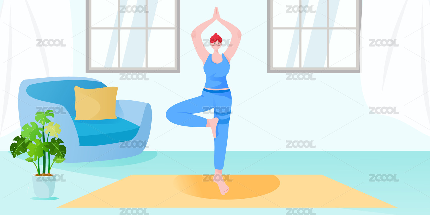 一个正在客厅做瑜珈动作的女生插画