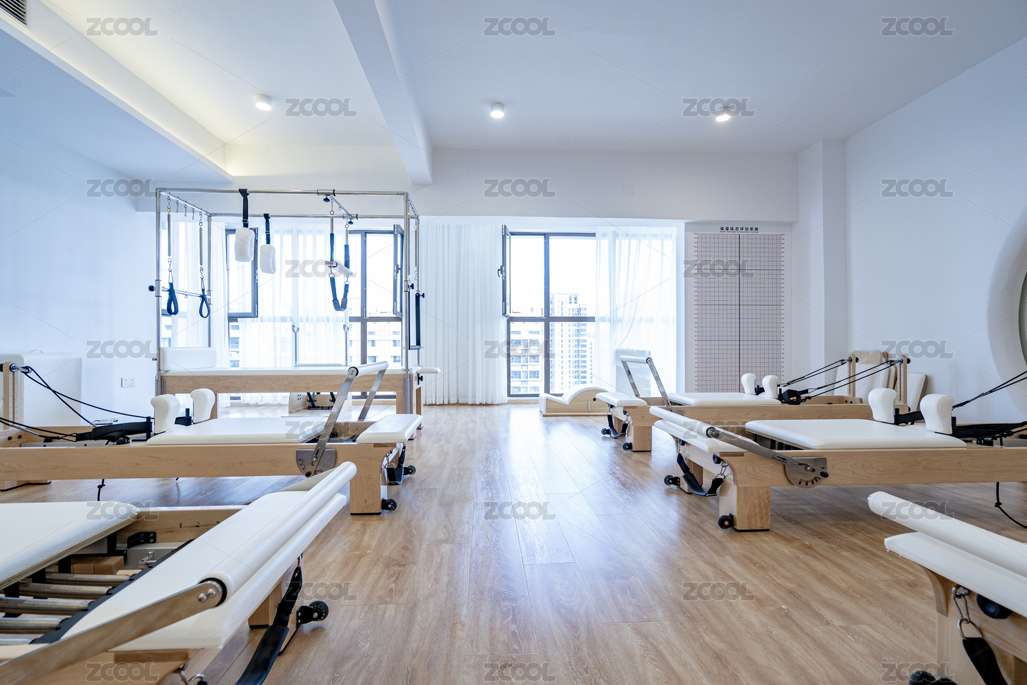 室内瑜珈馆木地板上摆放的普拉提器械