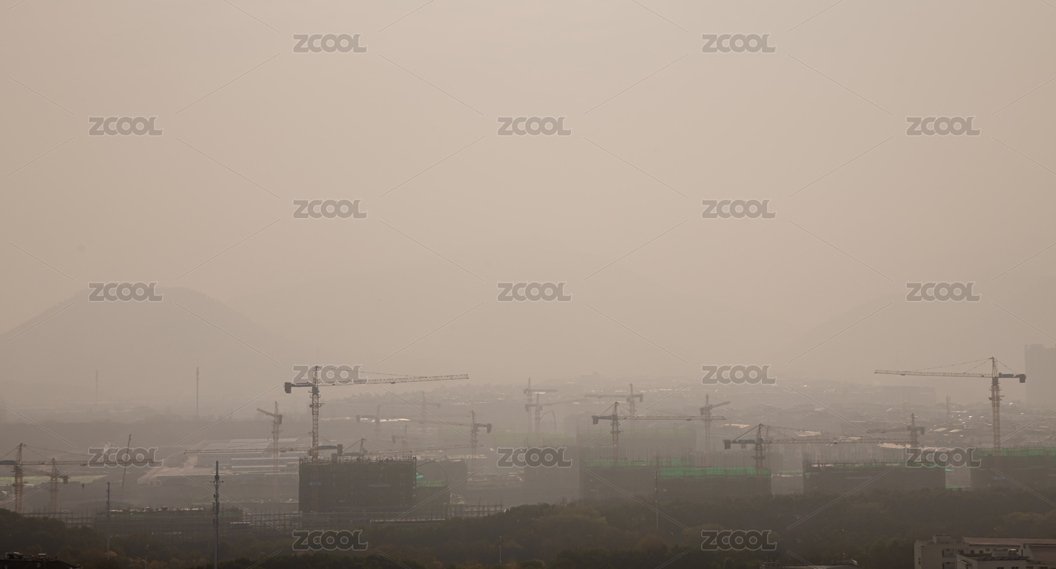 雾霾天里开着塔吊的建筑工地