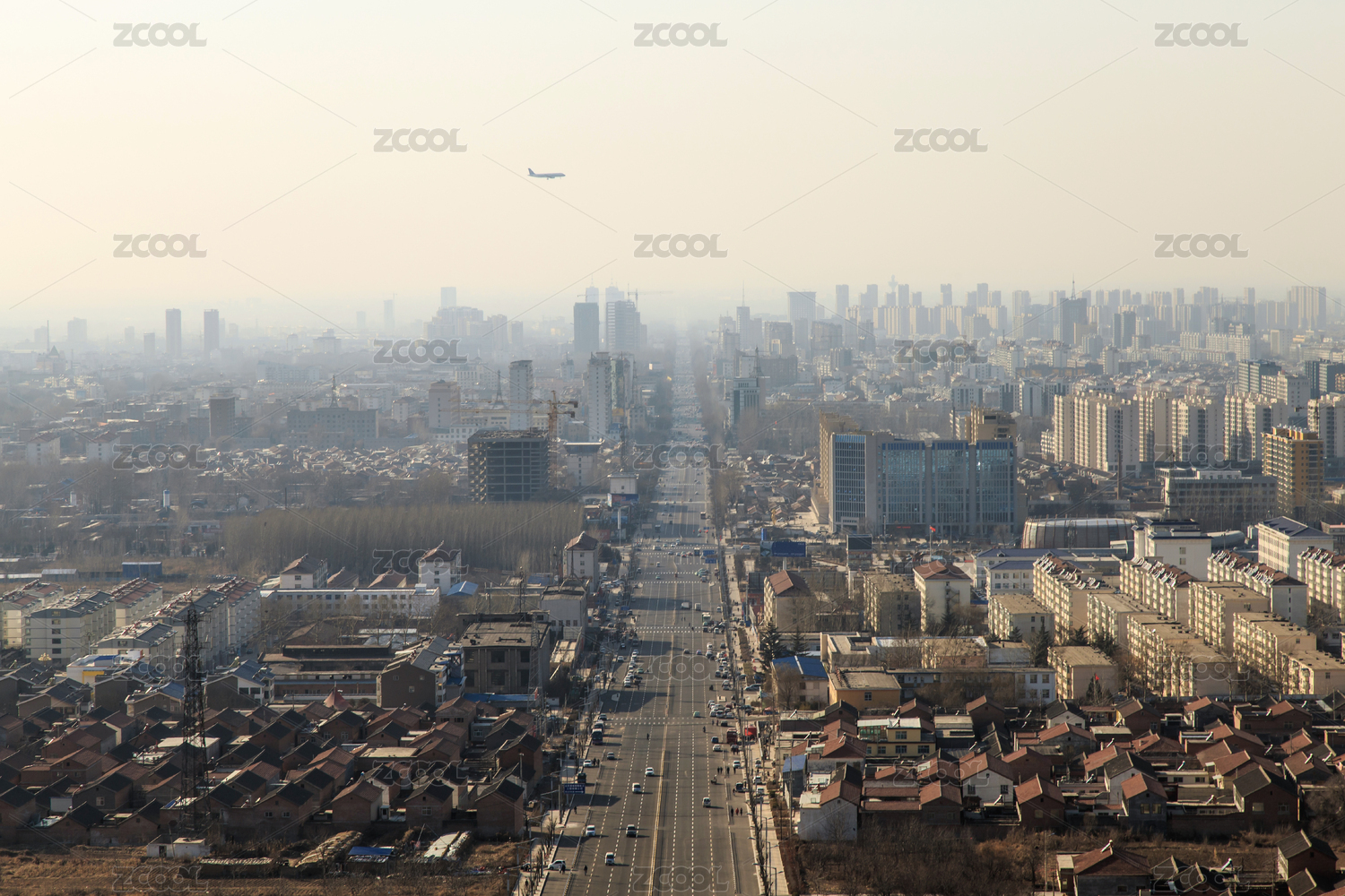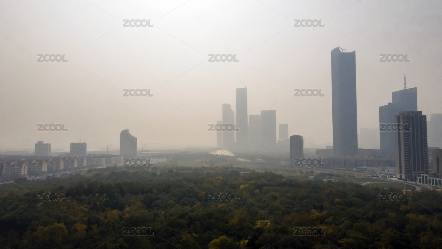 中国天津滨海新区紫云公园鸟瞰雾霾中的城市建筑