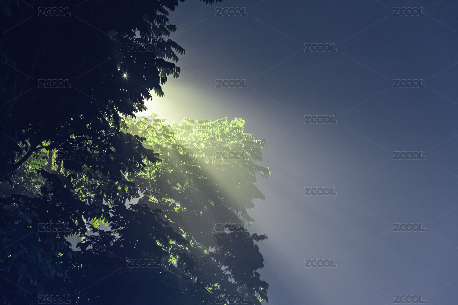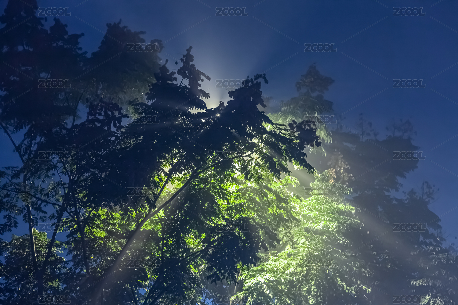 夜晚雾霾笼罩树枝路灯灯光穿透树叶散射光线