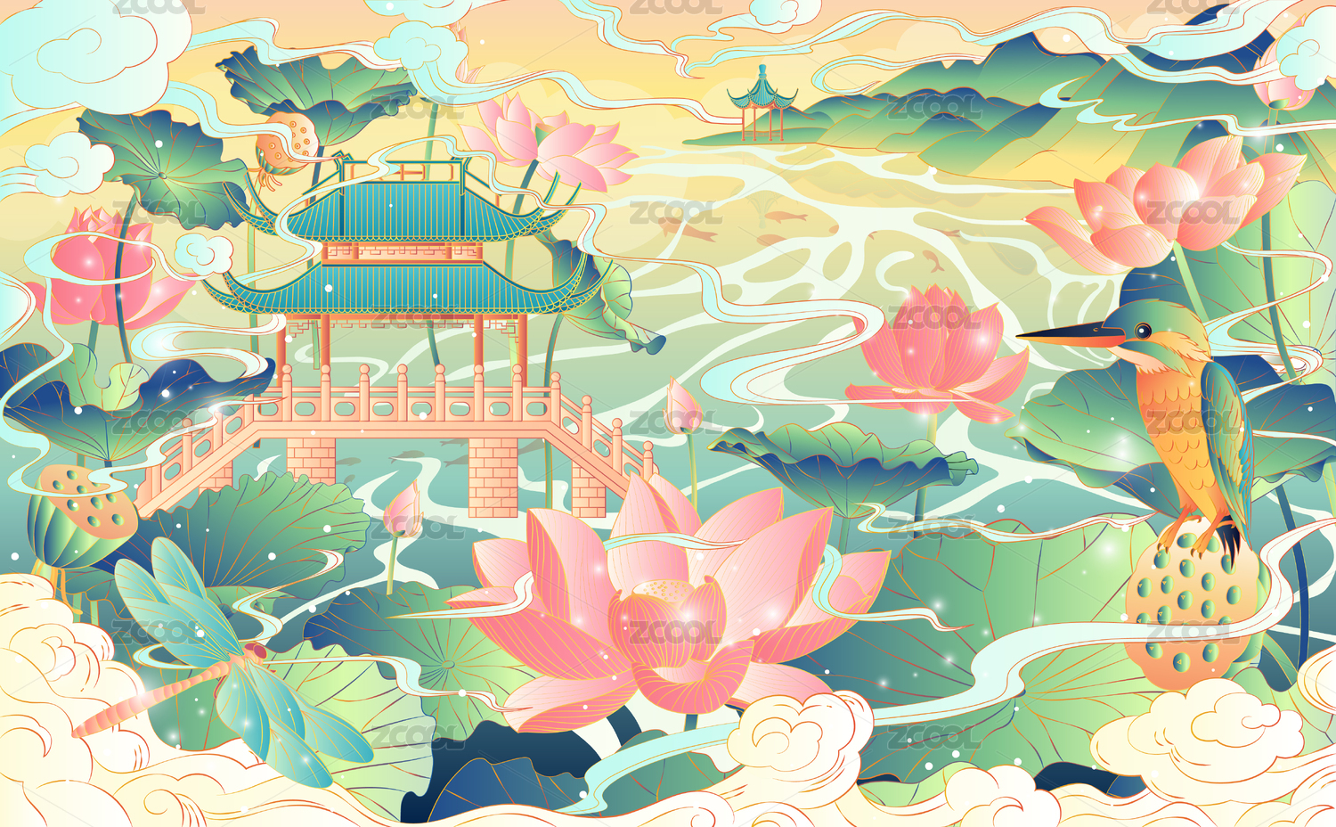 杭州西湖十景国潮矢量风景插画曲院风荷