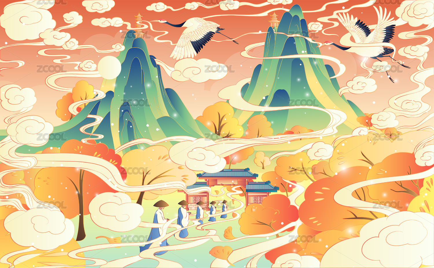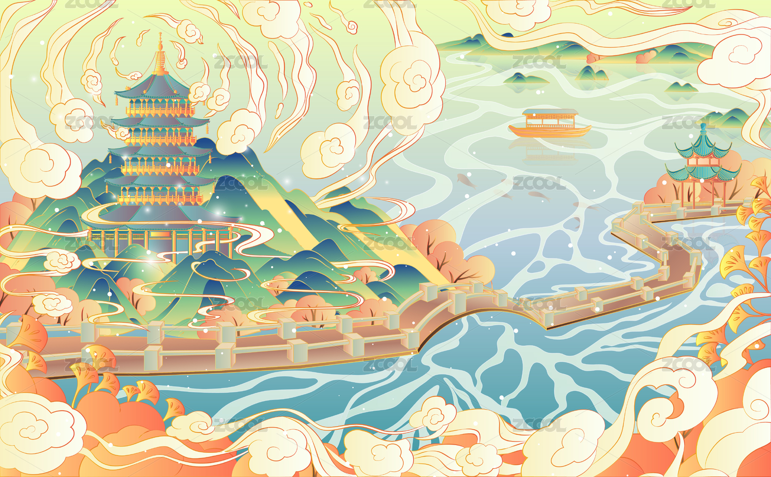 杭州西湖十景国潮矢量风景插画双峰插云