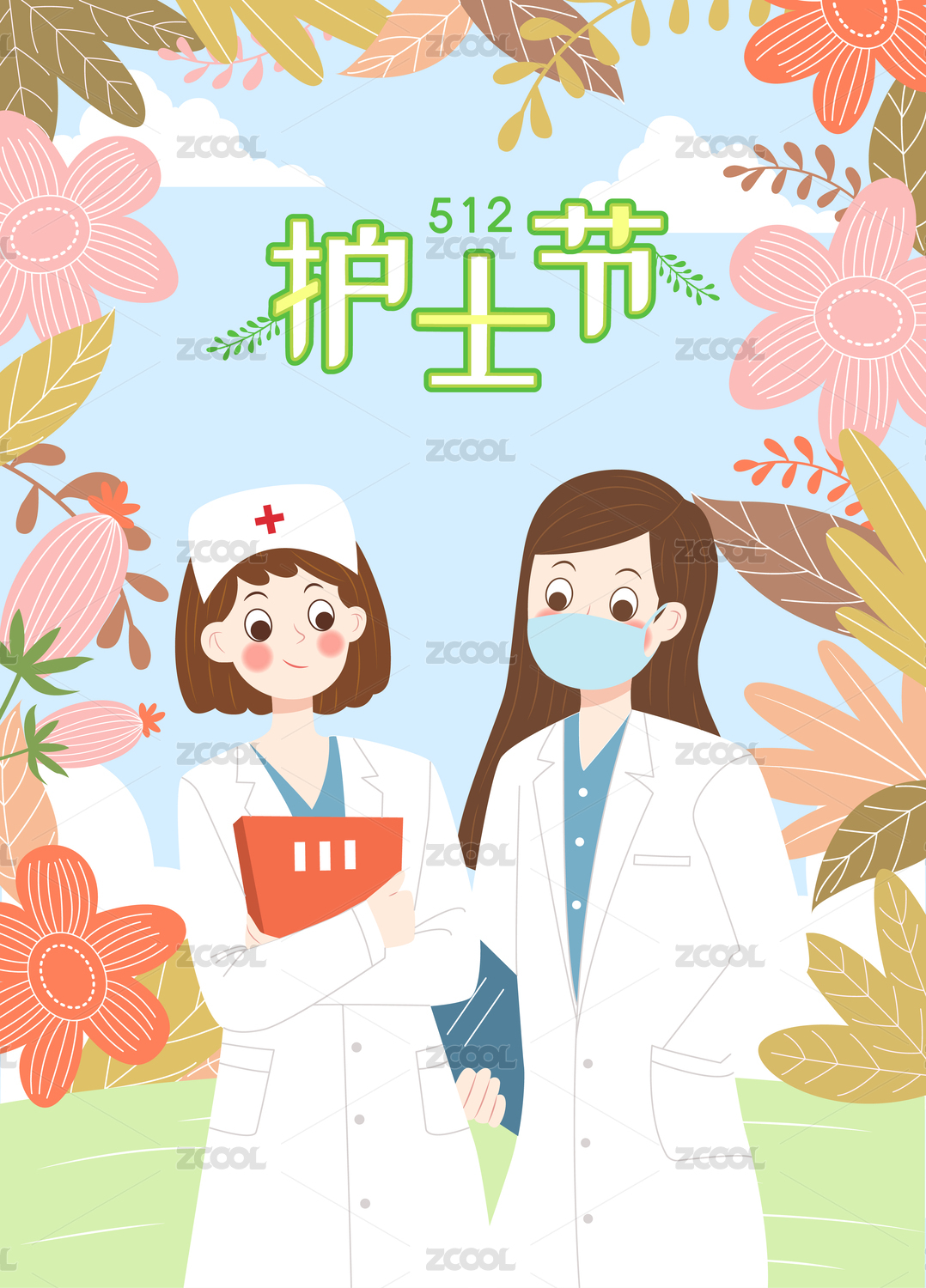 护士节小姐姐带口罩白大褂鲜花边框海报