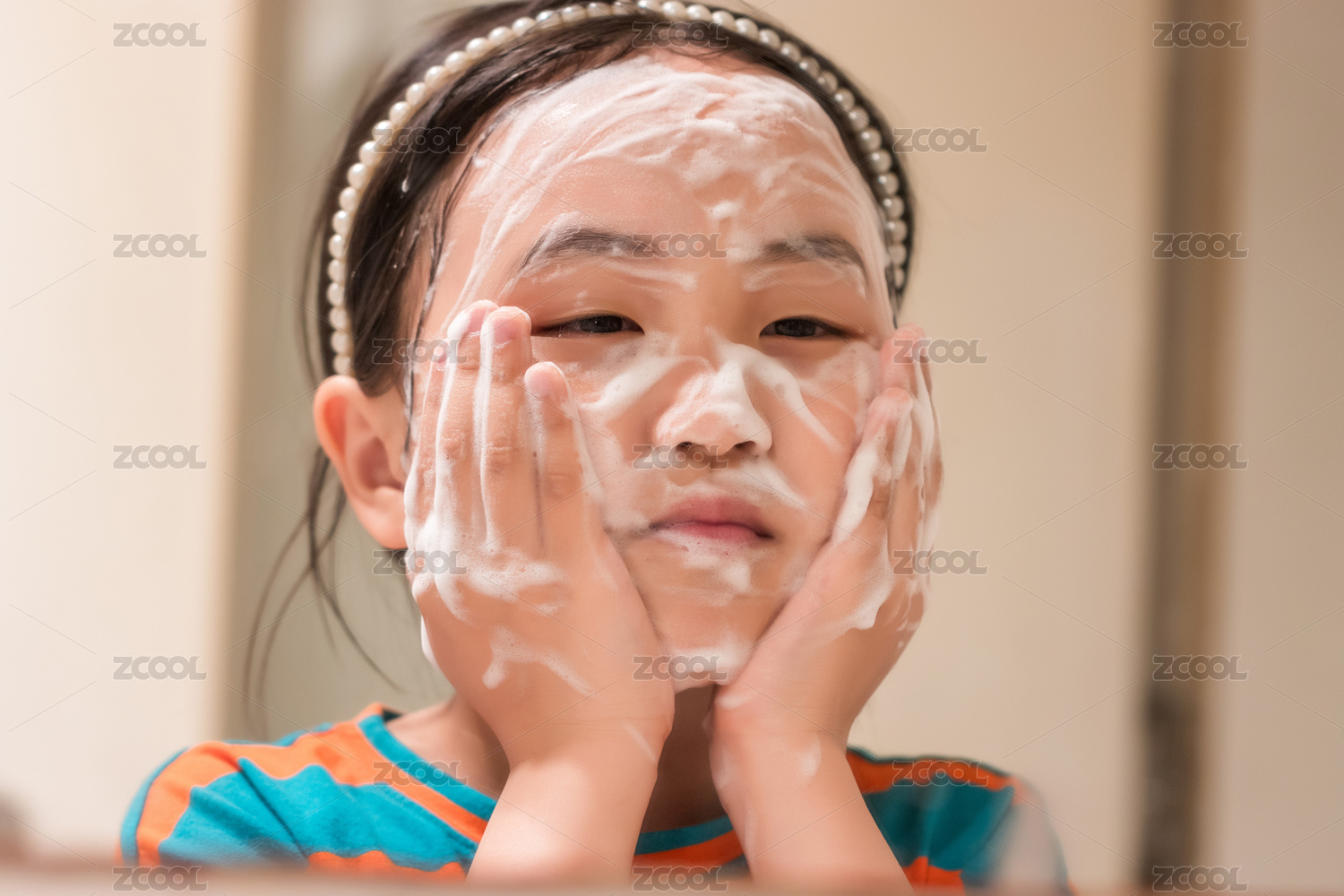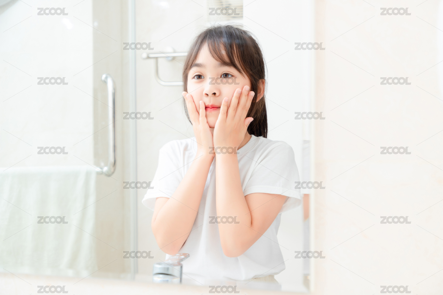 镜子里洗脸的亚洲小女孩