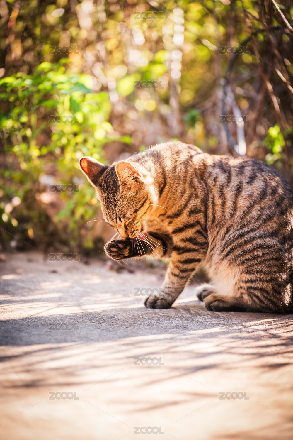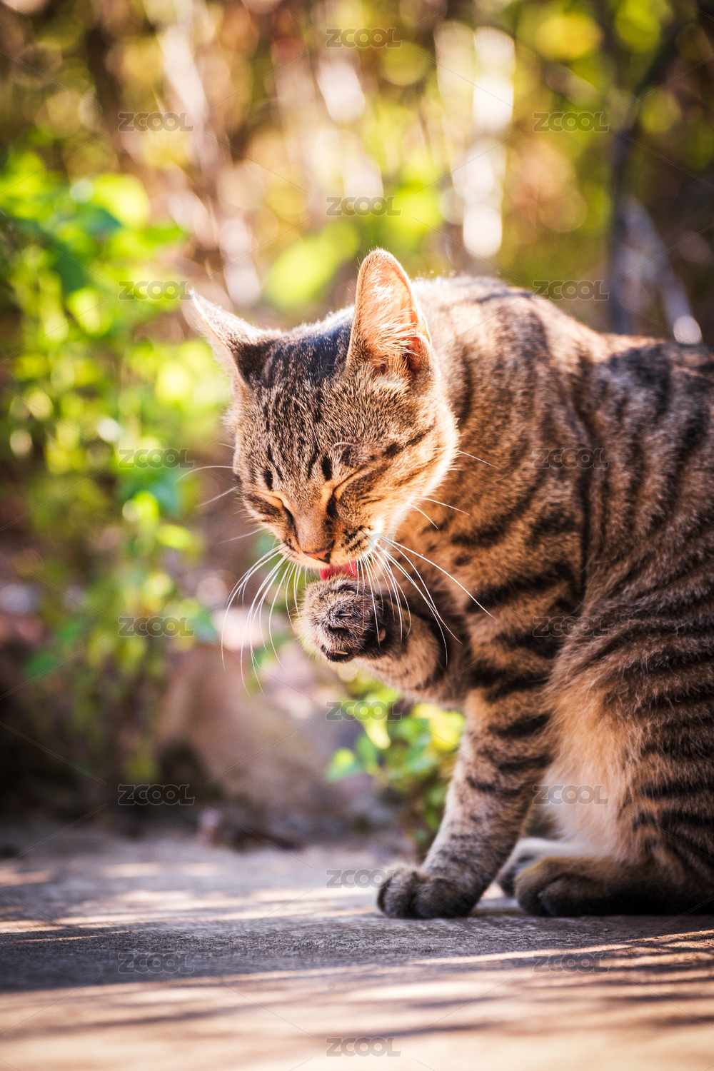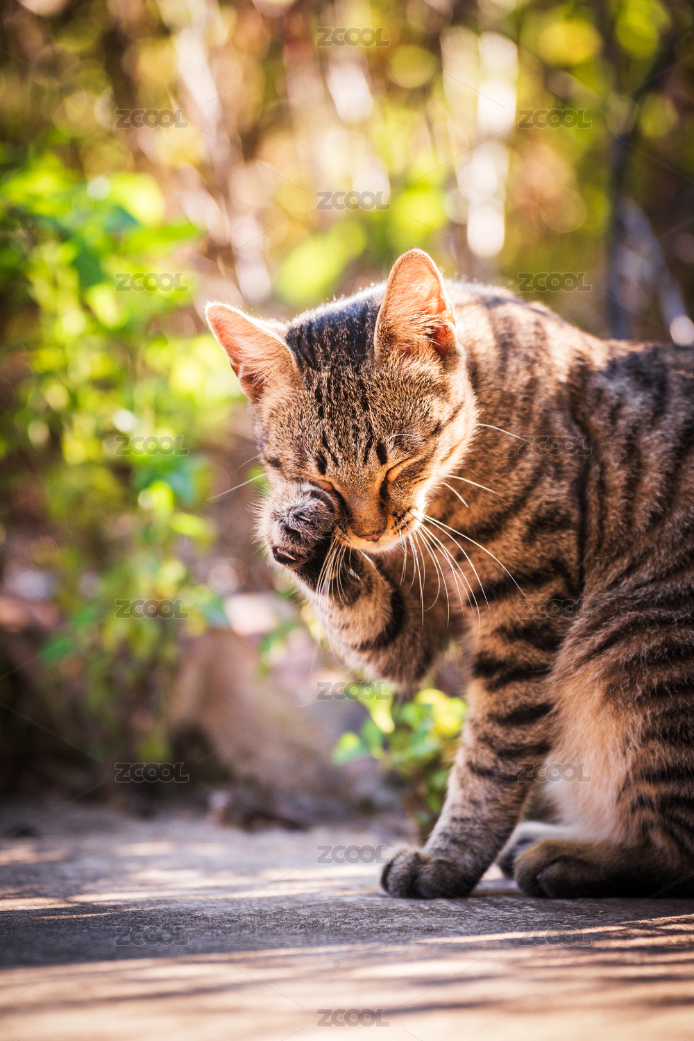 阳光下洗脸的狸花猫