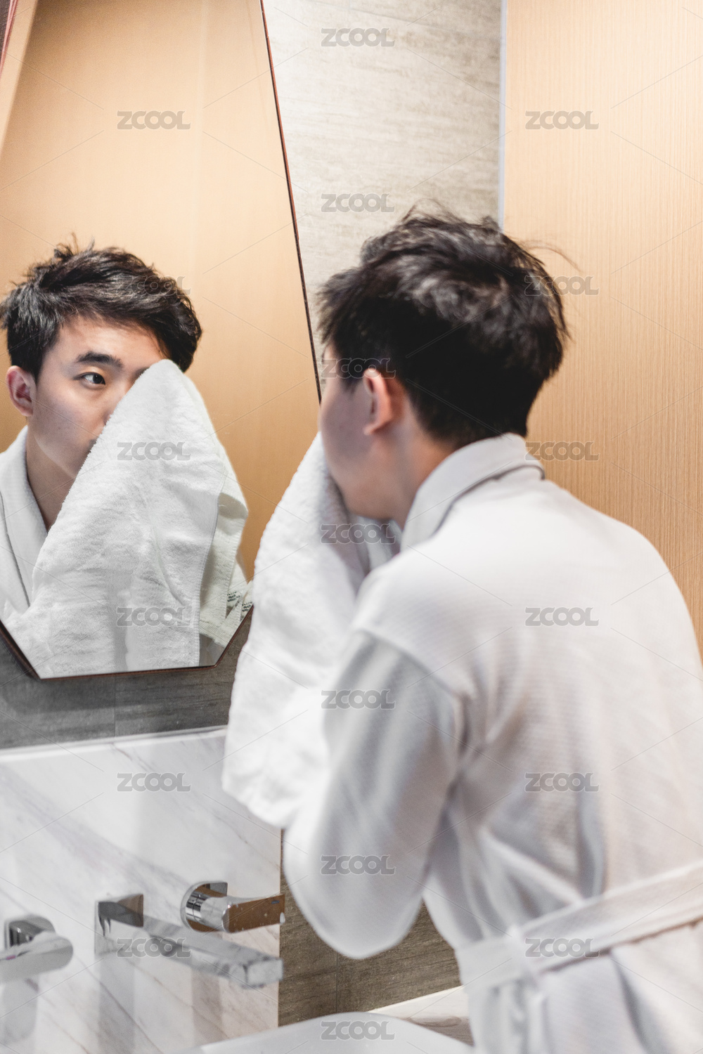 亚洲男青年身穿浴袍在镜前洗脸