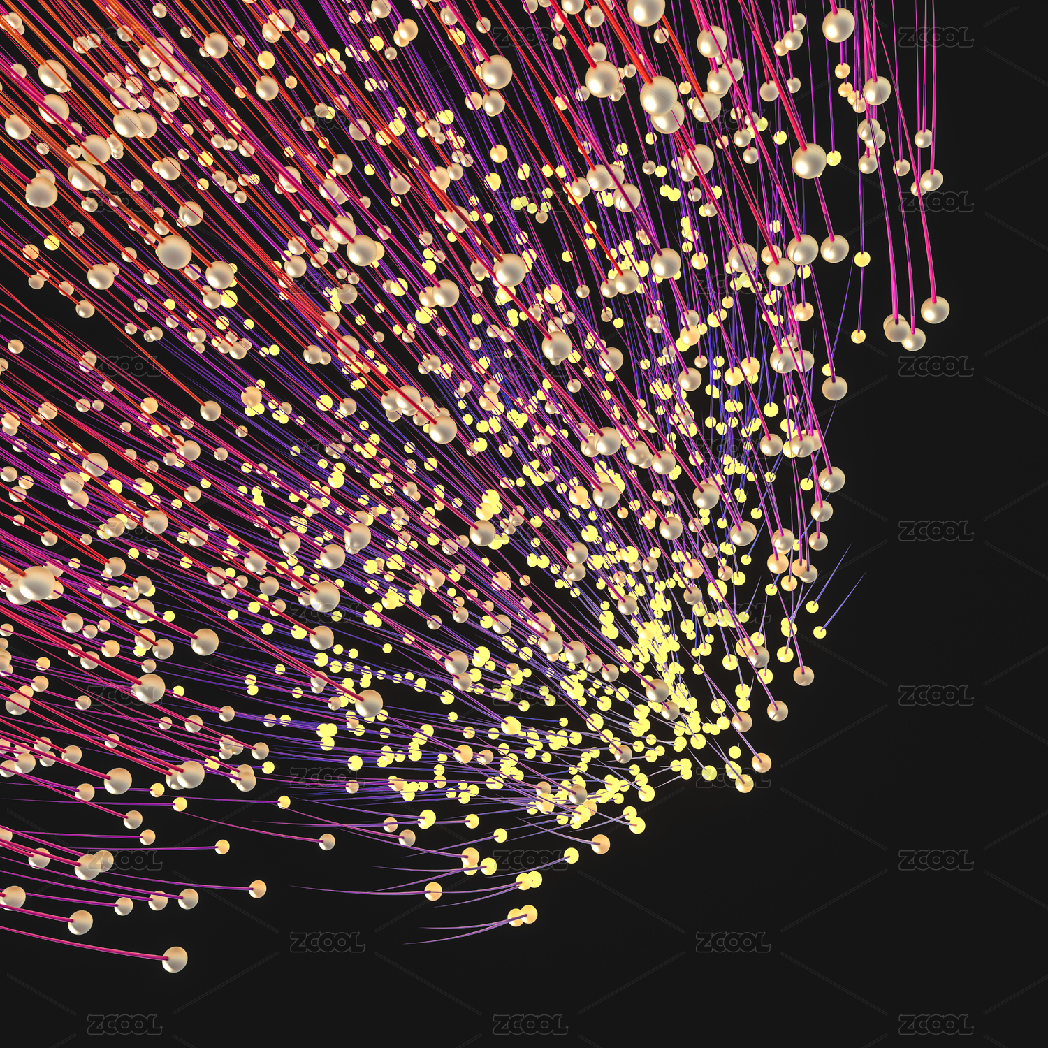 发散的金色发光小球与线条,三维渲染