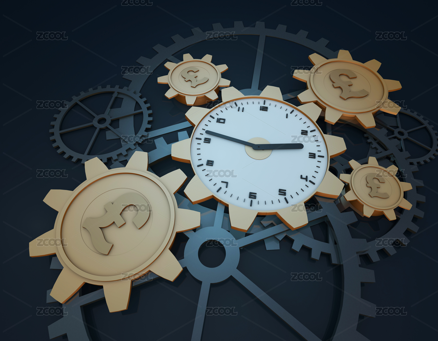 英镑符号齿轮与时钟齿轮相互连接转动,代表着时间就是金钱与时间的积累创造财富