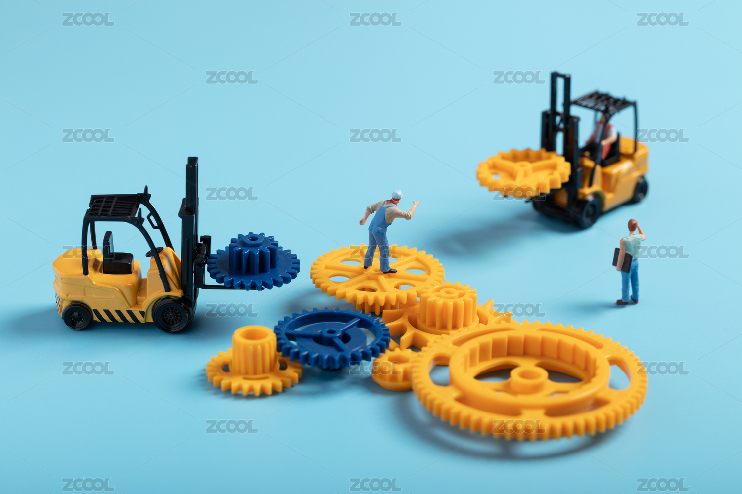 微缩创意组合彩色齿轮的叉车与工程师