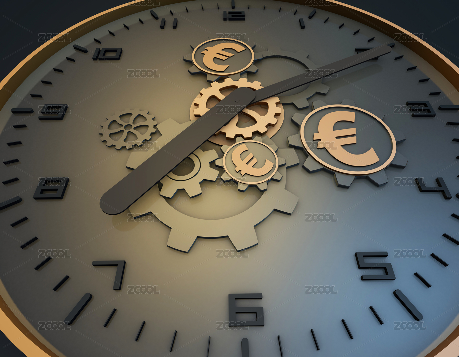 欧元符号齿轮与时钟齿轮相互连接转动,代表着时间就是金钱与时间的积累创造财富