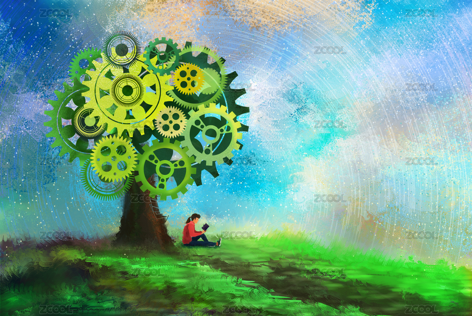 一个女孩在齿轮的树下读书