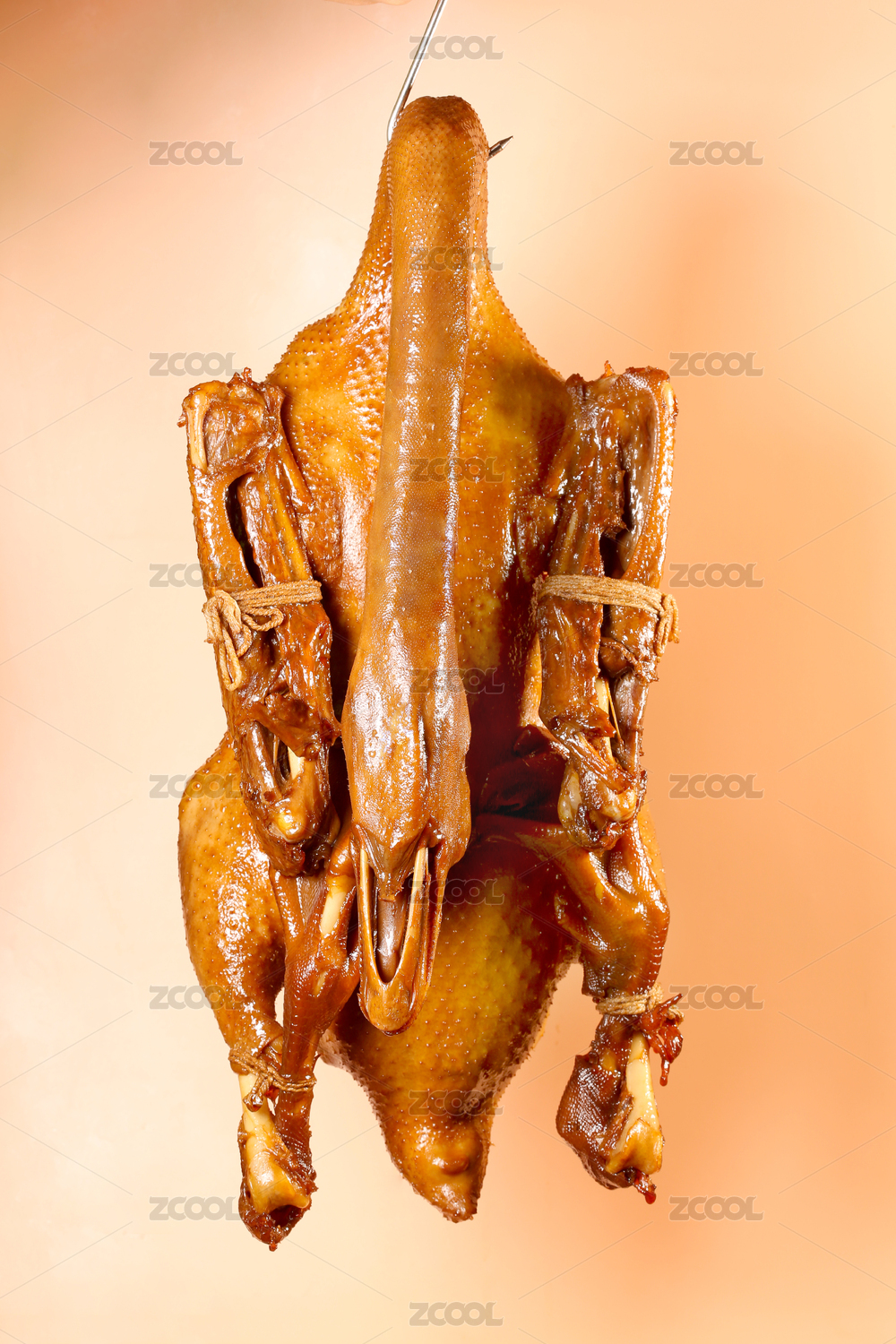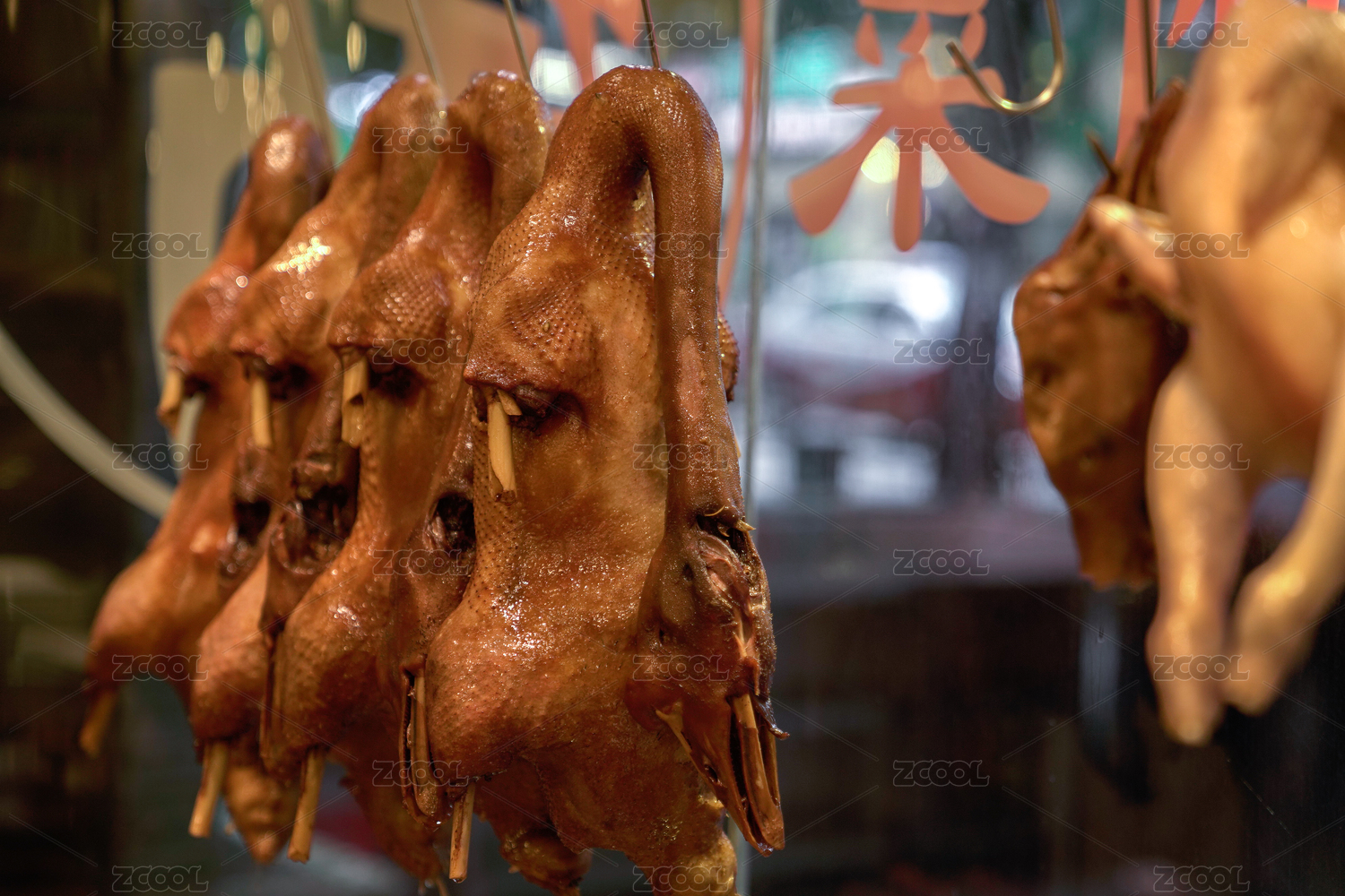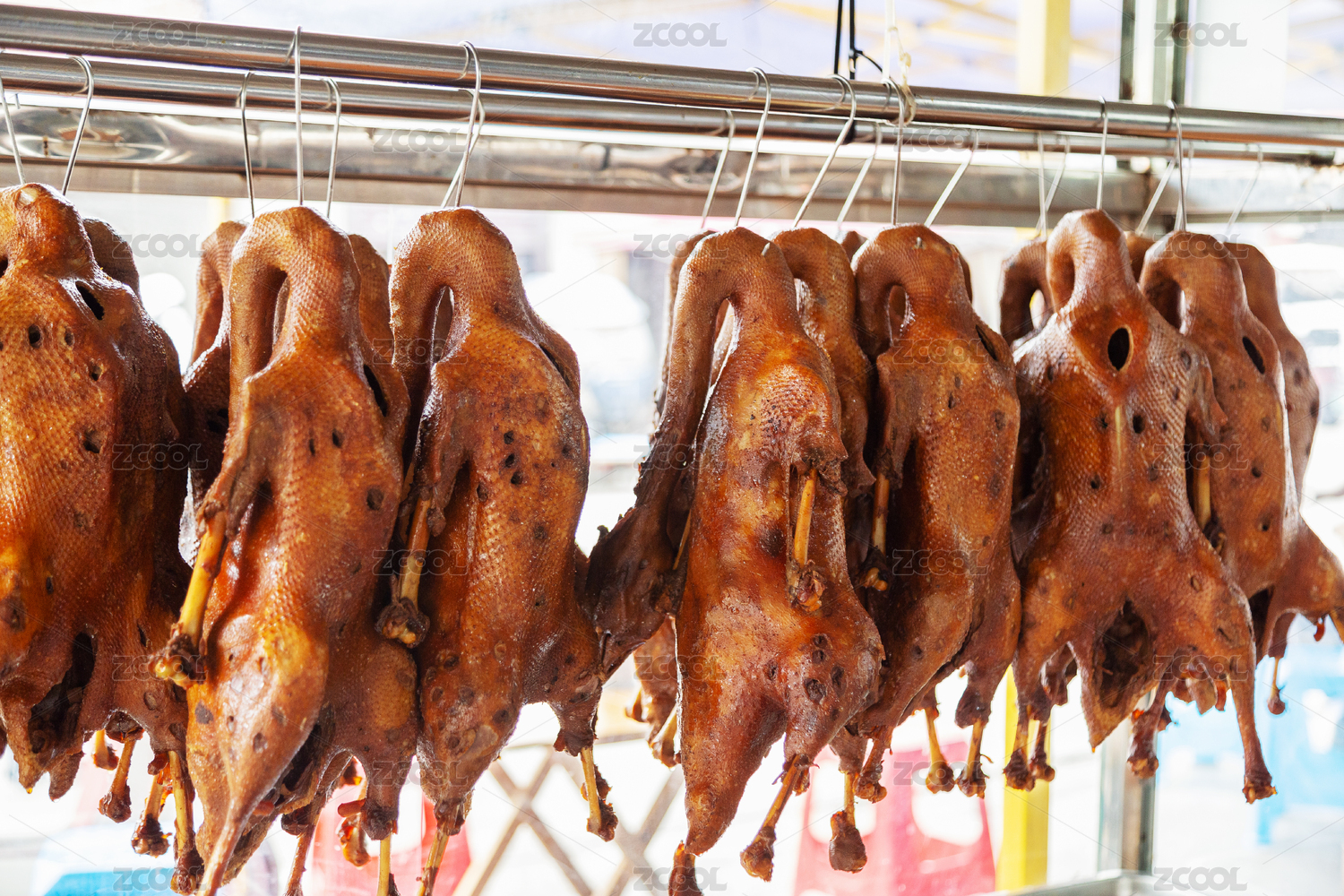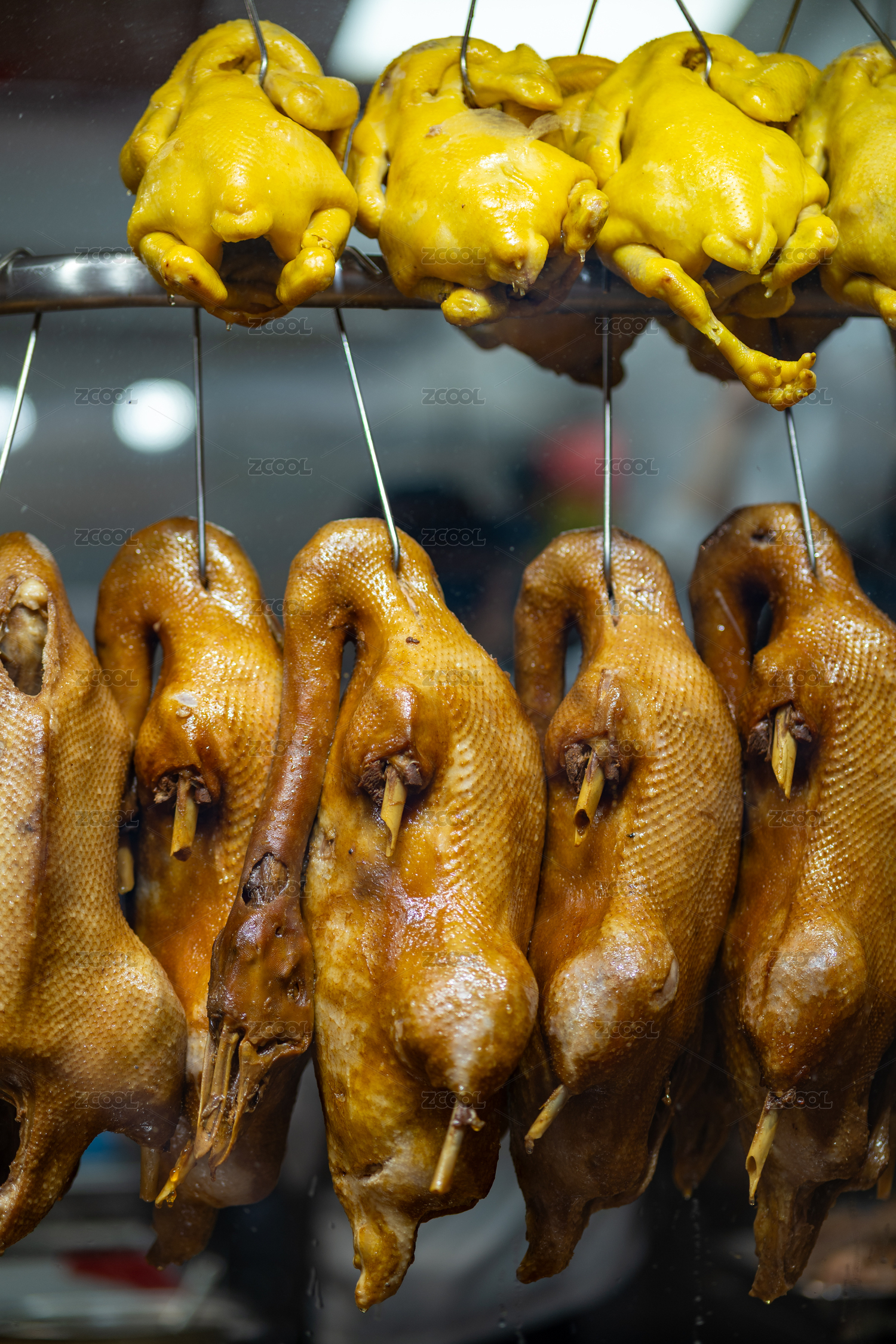 餐厅橱窗里悬挂着的卤鹅和油鸡
