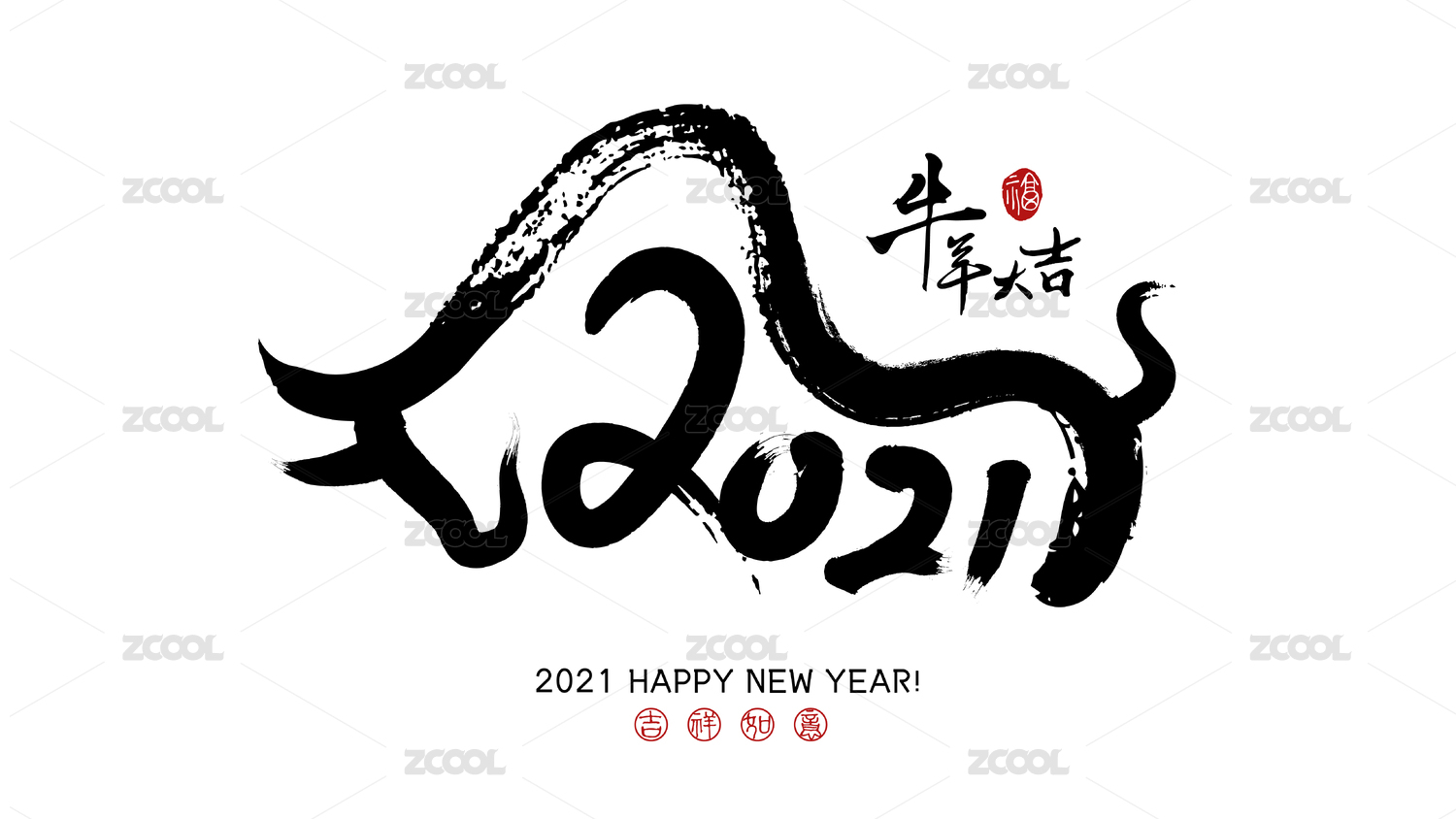 矢量中式2021牛年创意书法国画组合
