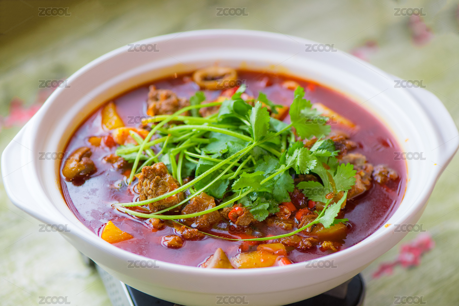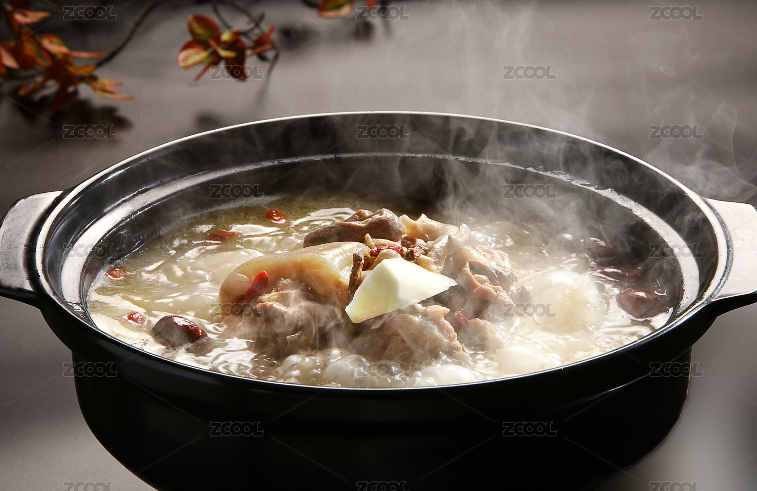 白色汤锅里冒着热气的羊肉汤锅