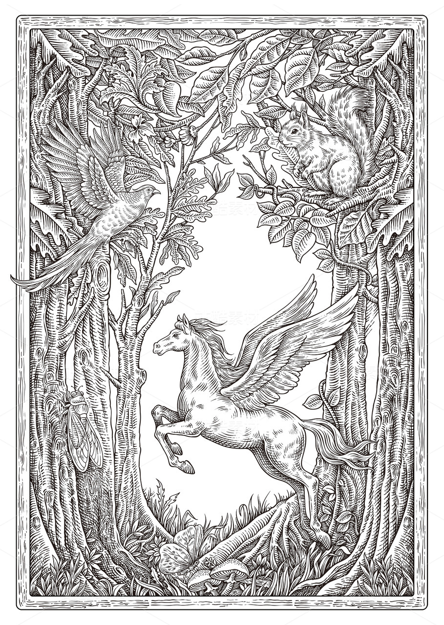 长白山以梦为马植物动物森林分层矢量可编辑线稿版画