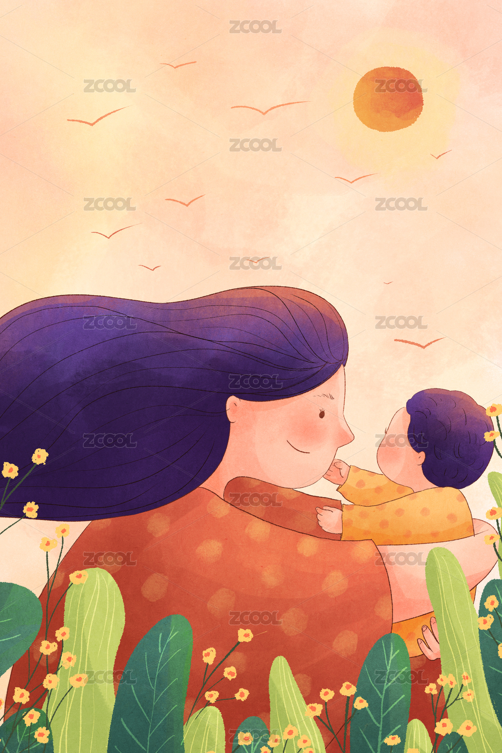 母亲怀抱幼儿母亲节亲子海报插画