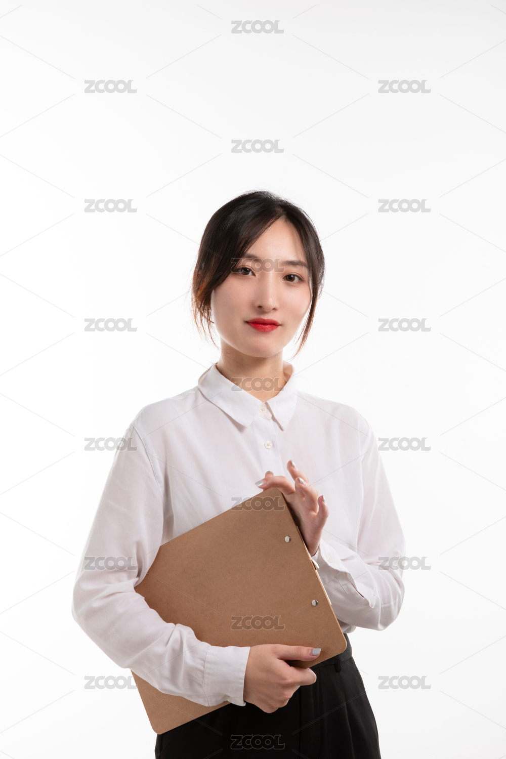白色背景前怀抱写字板的职业装美女