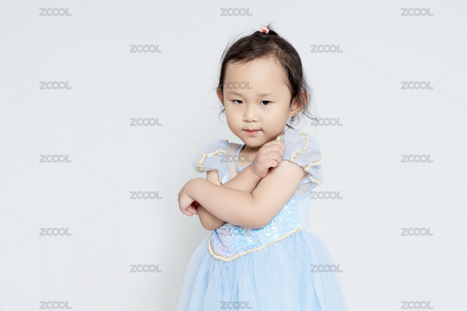 穿着蓝色公主裙怀抱站着的3岁女孩