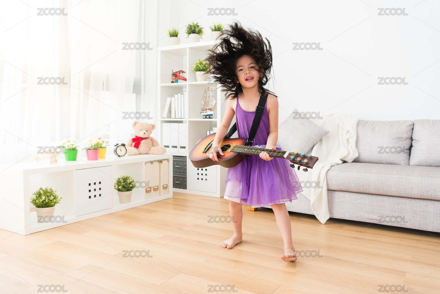疯狂可爱的亚洲女孩playig吉他和在客厅里跳。没有人能播放音乐阻止她。她喜欢它,并在木吉他充满了激情。