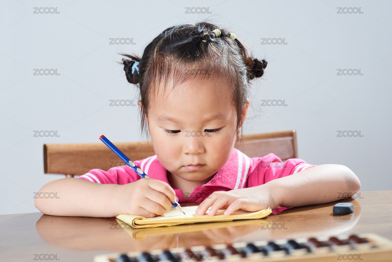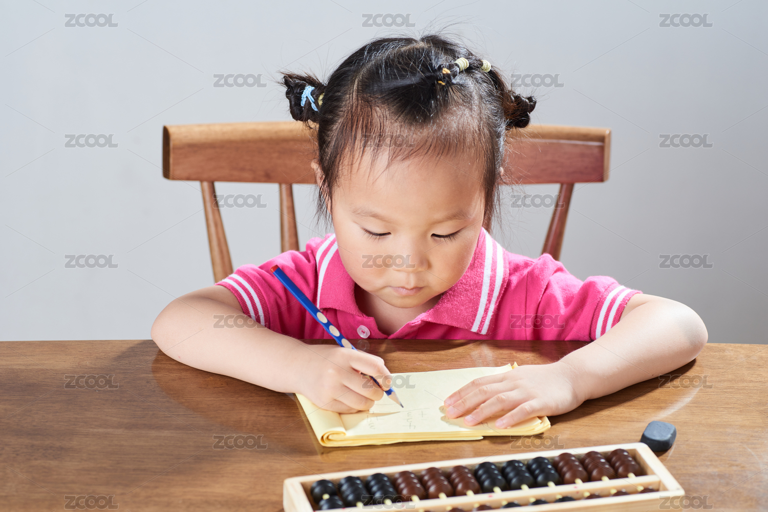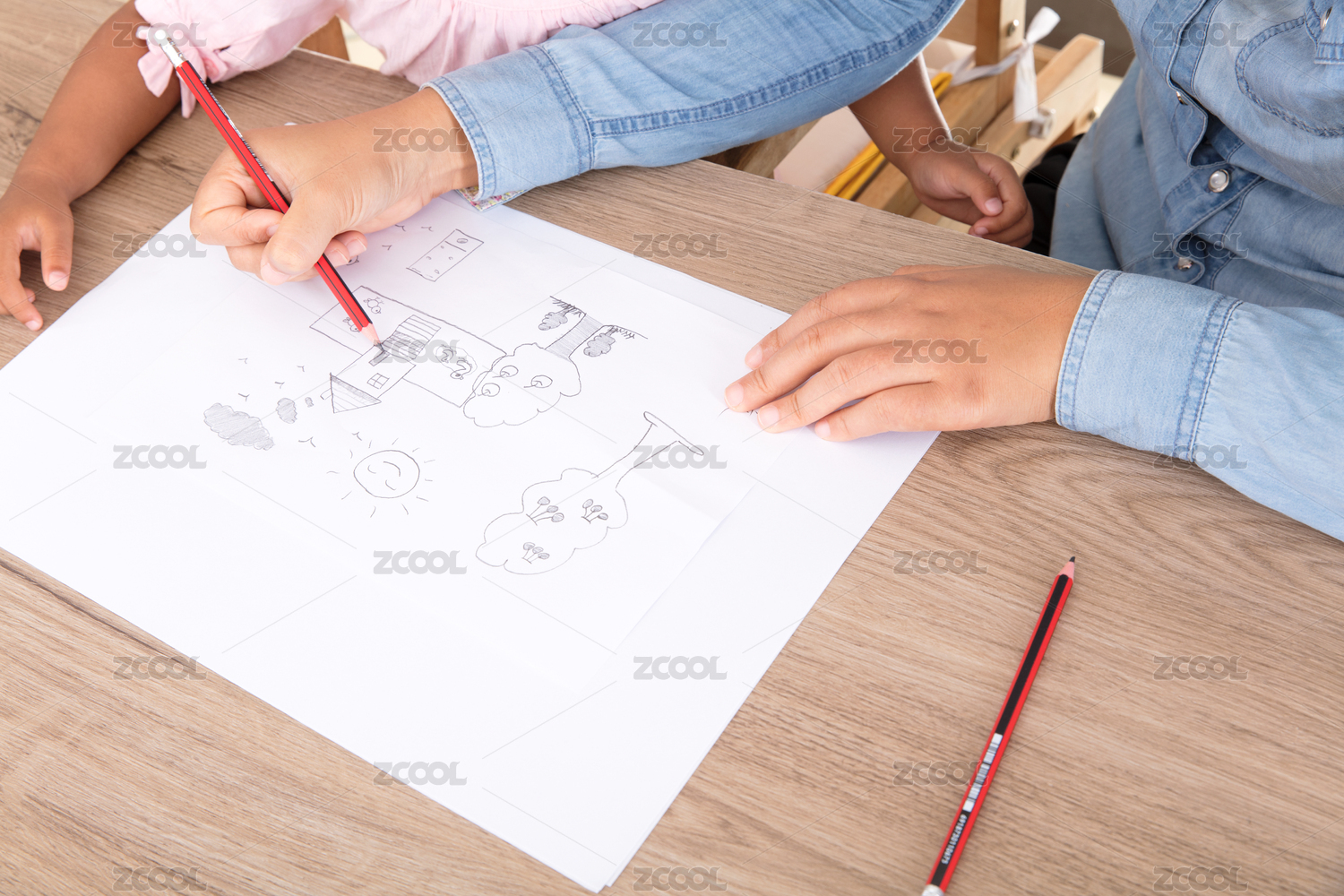 年轻的妈妈或幼教老师在认真的辅导小女孩画画
