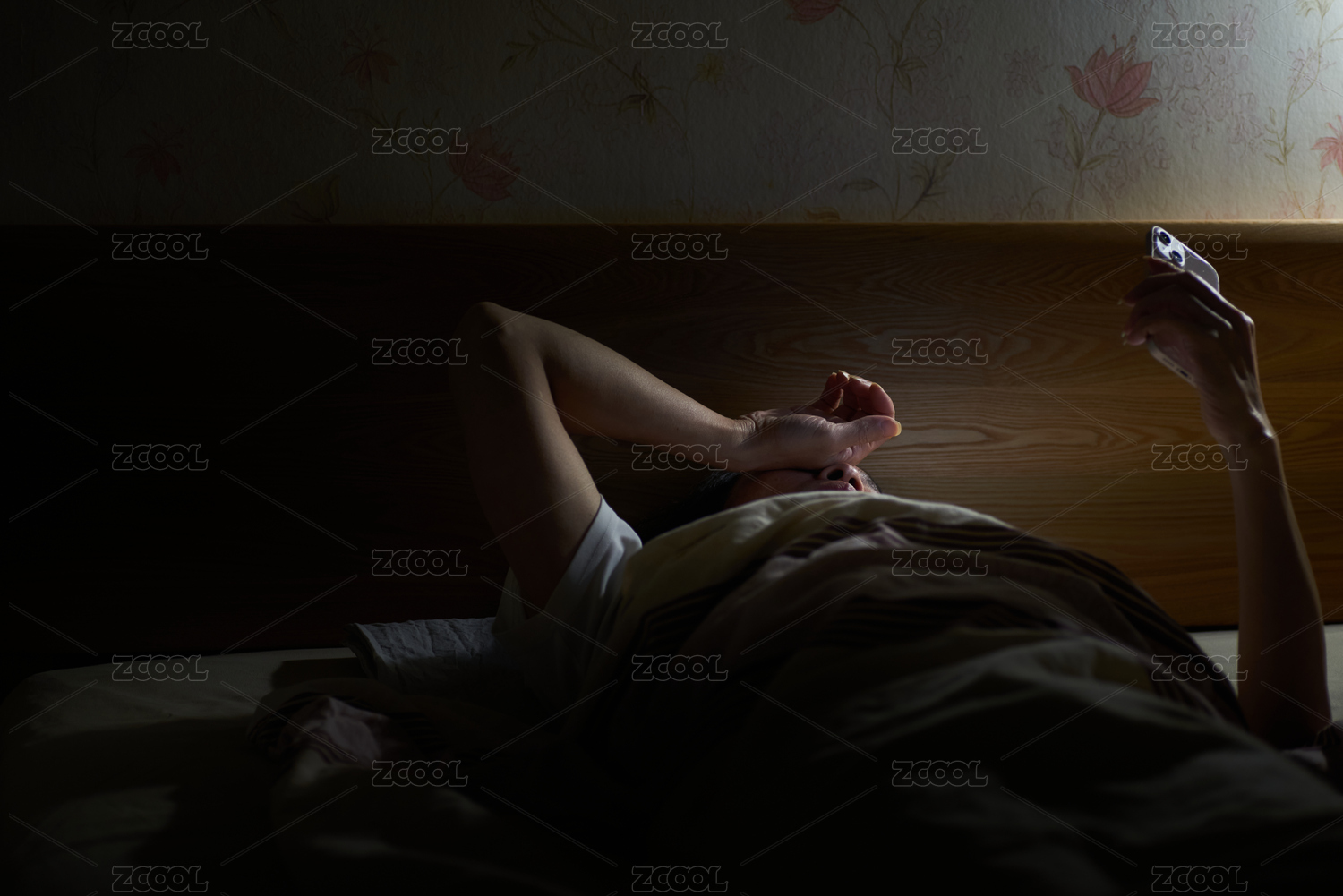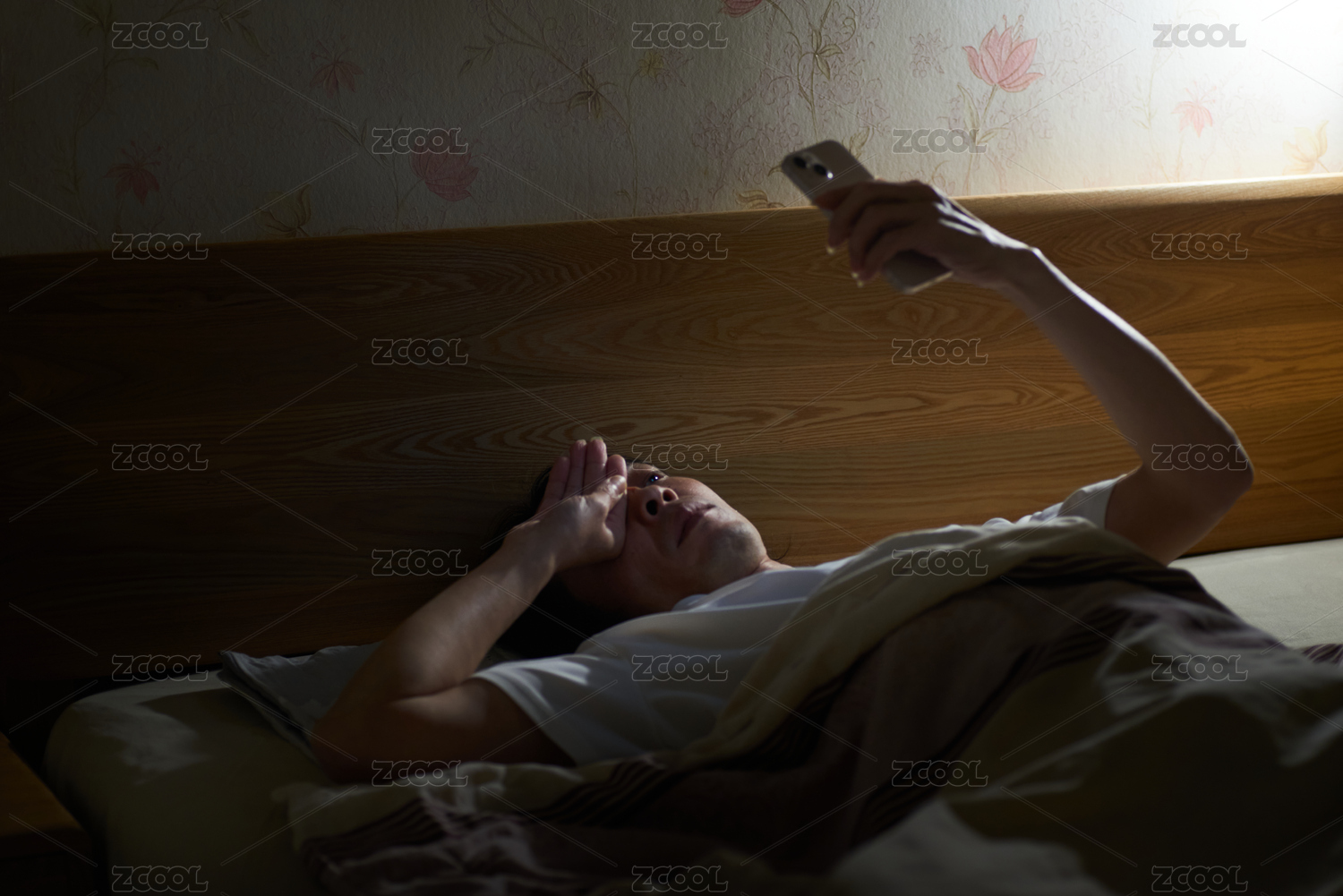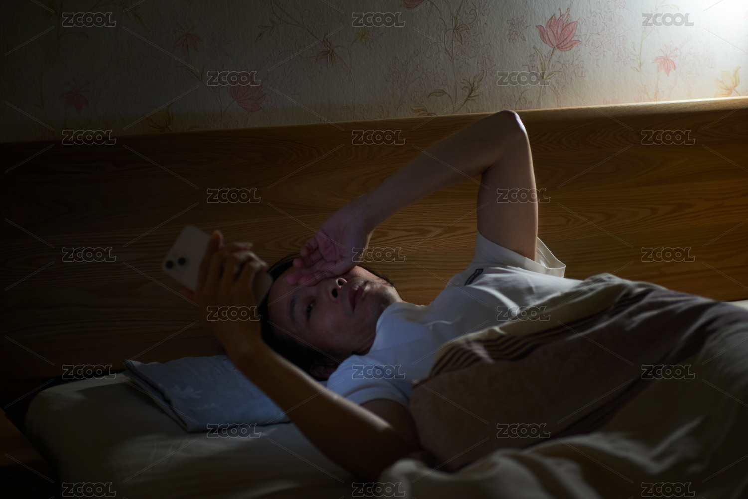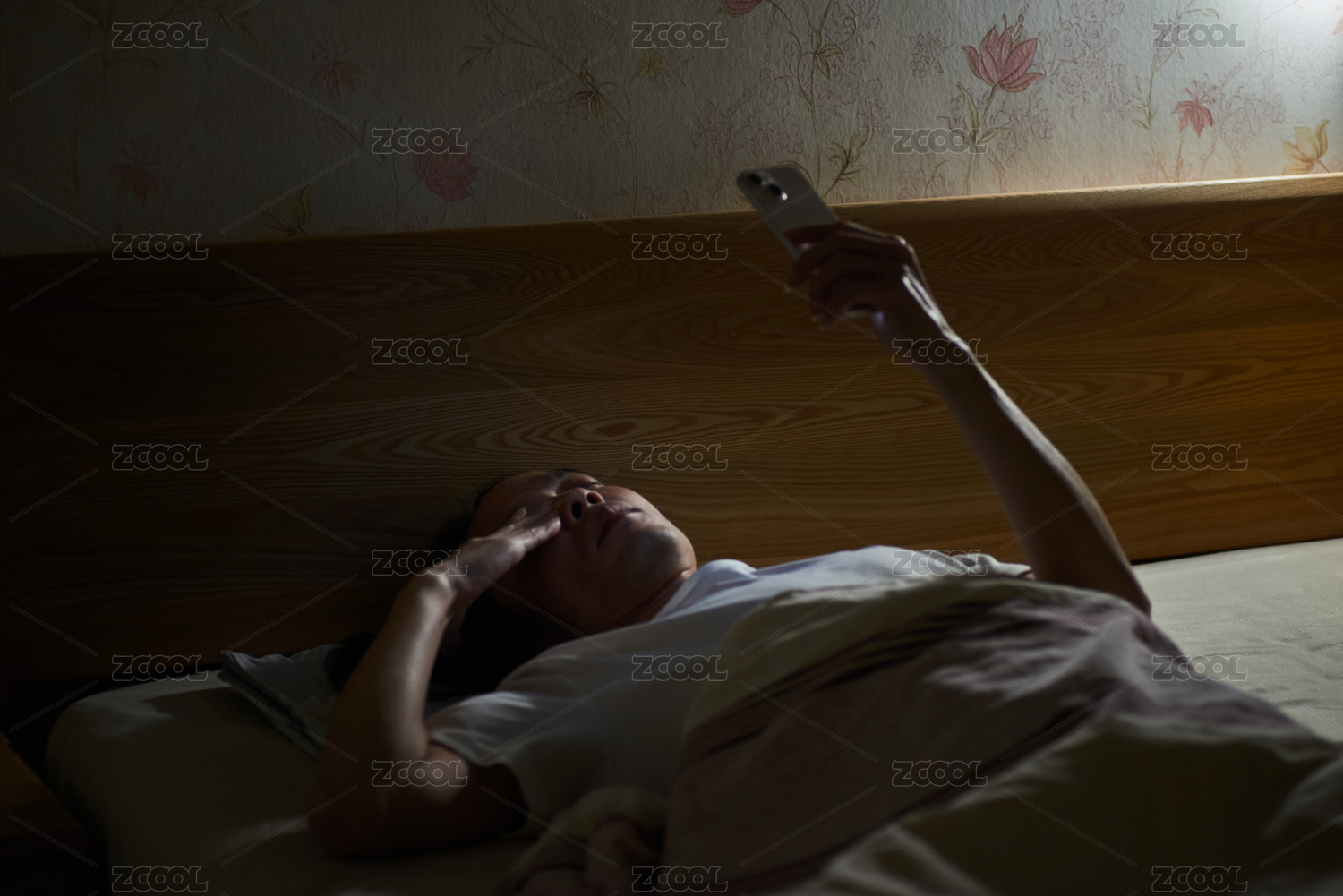 深夜躺在床上看手机的中年男子