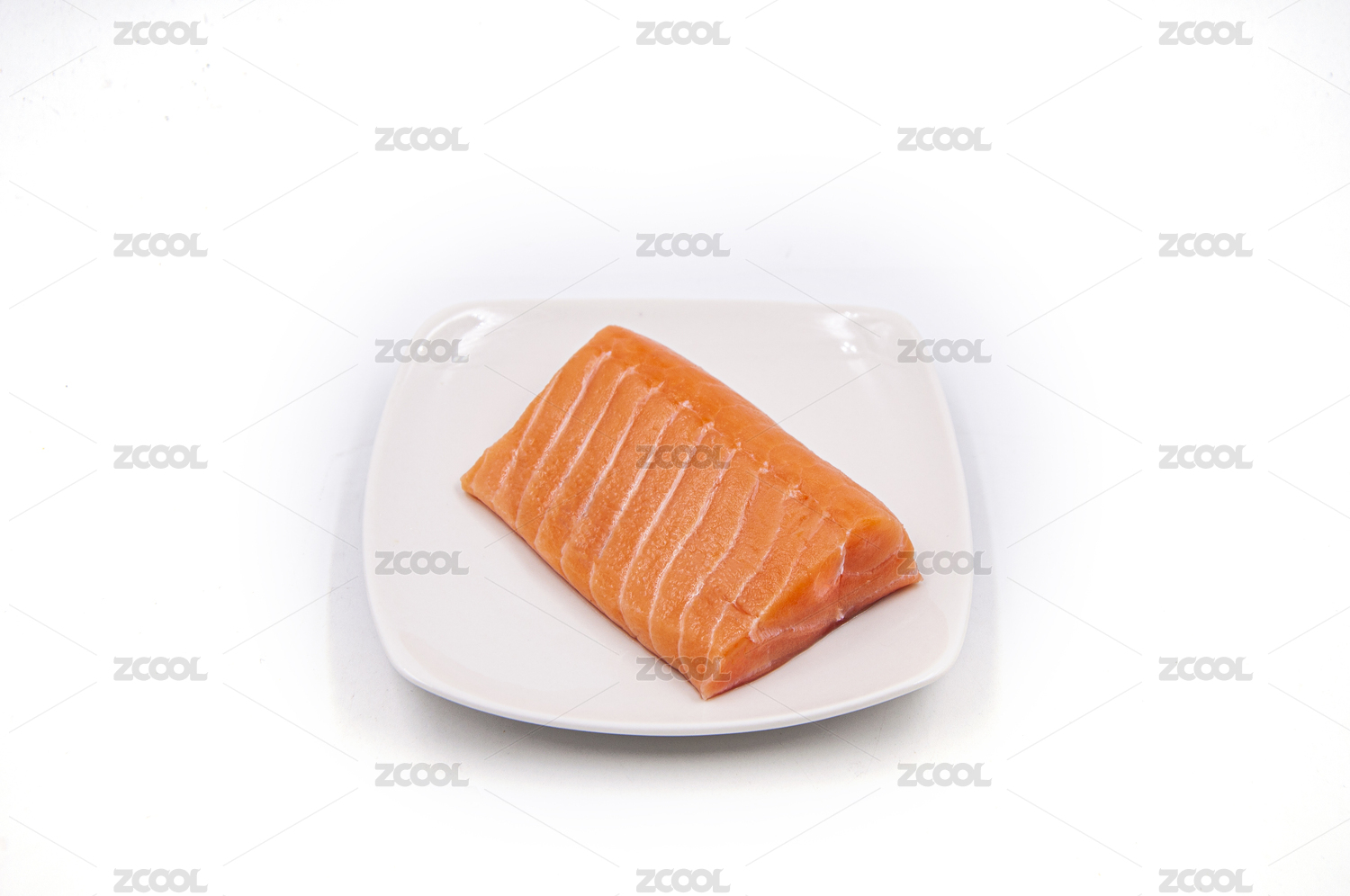 放在白色陶瓷盘子里的新鲜三文鱼肉块