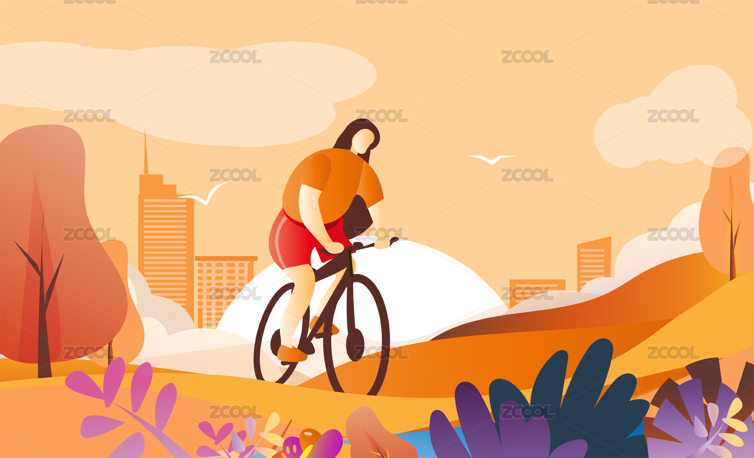 卡通女性独立骑行逃离都市亲近自然海报