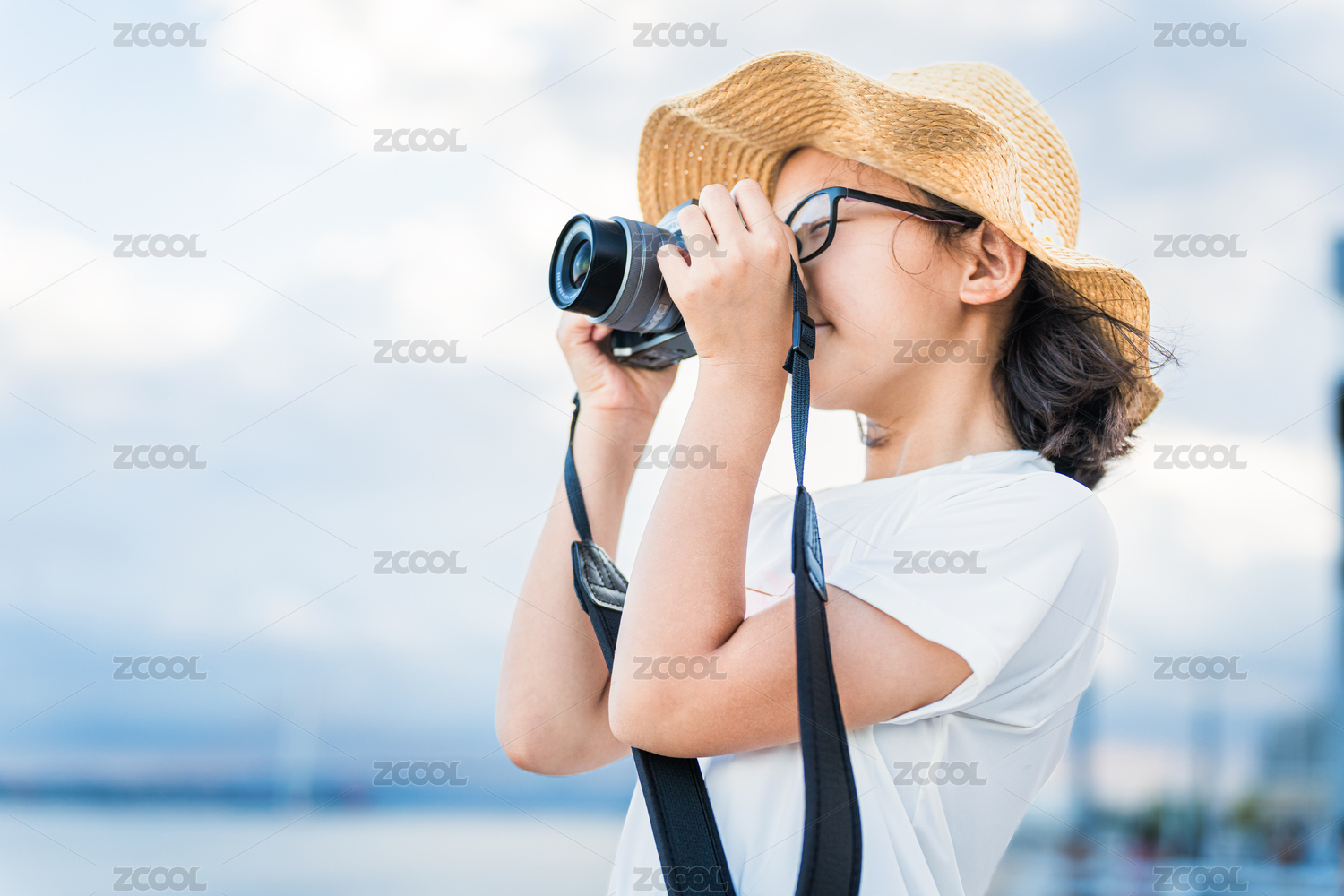 小女孩手持相机专注拍照的样子