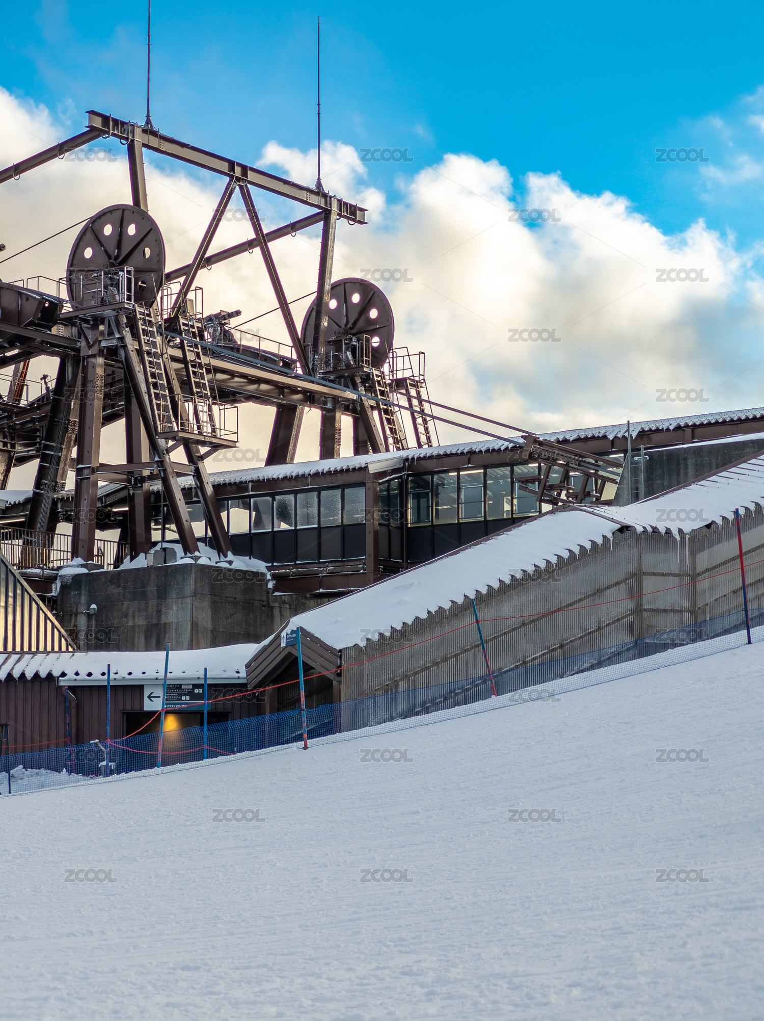 白雪覆盖的山地景观与琵琶湖山谷缆车
