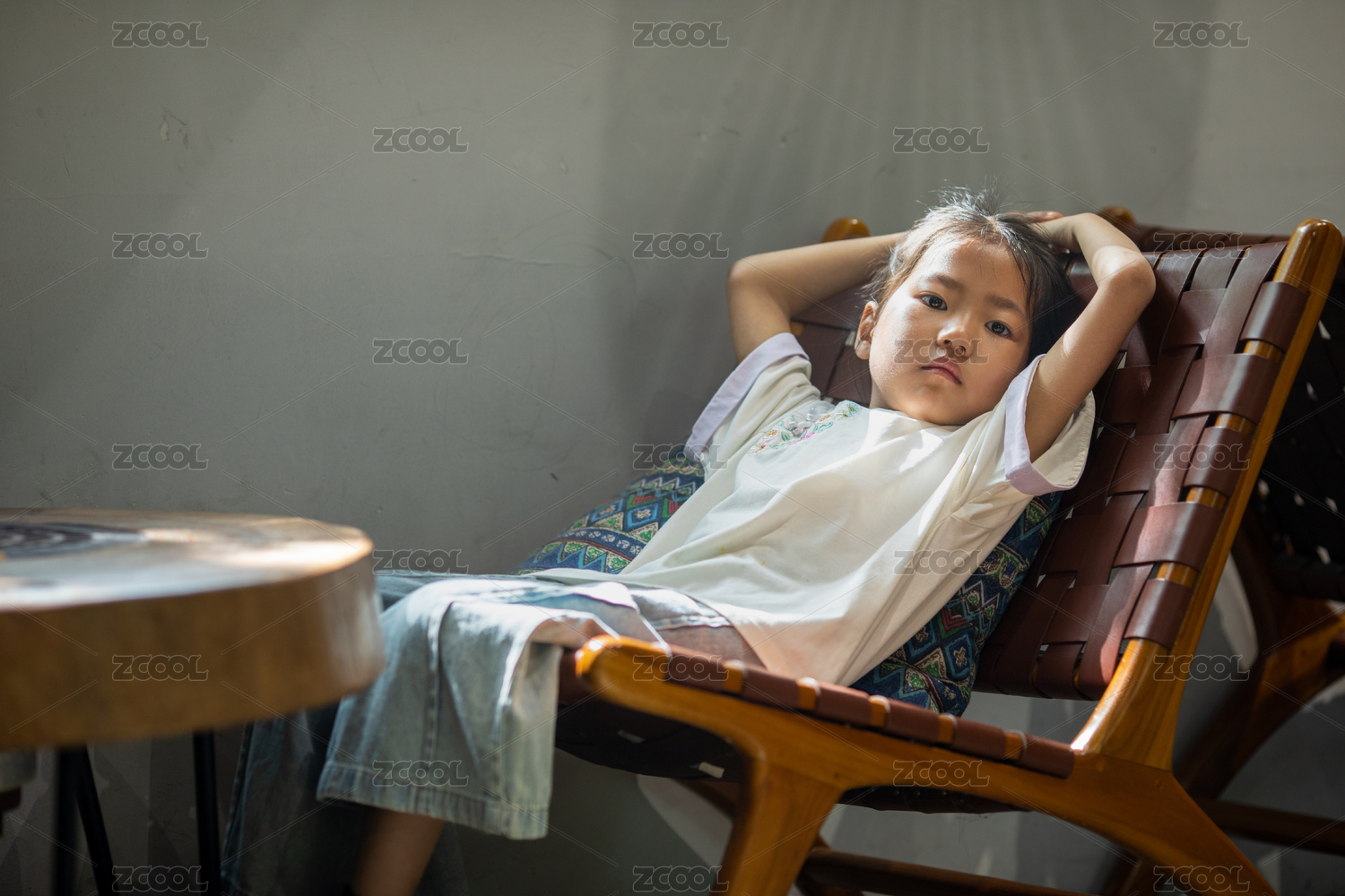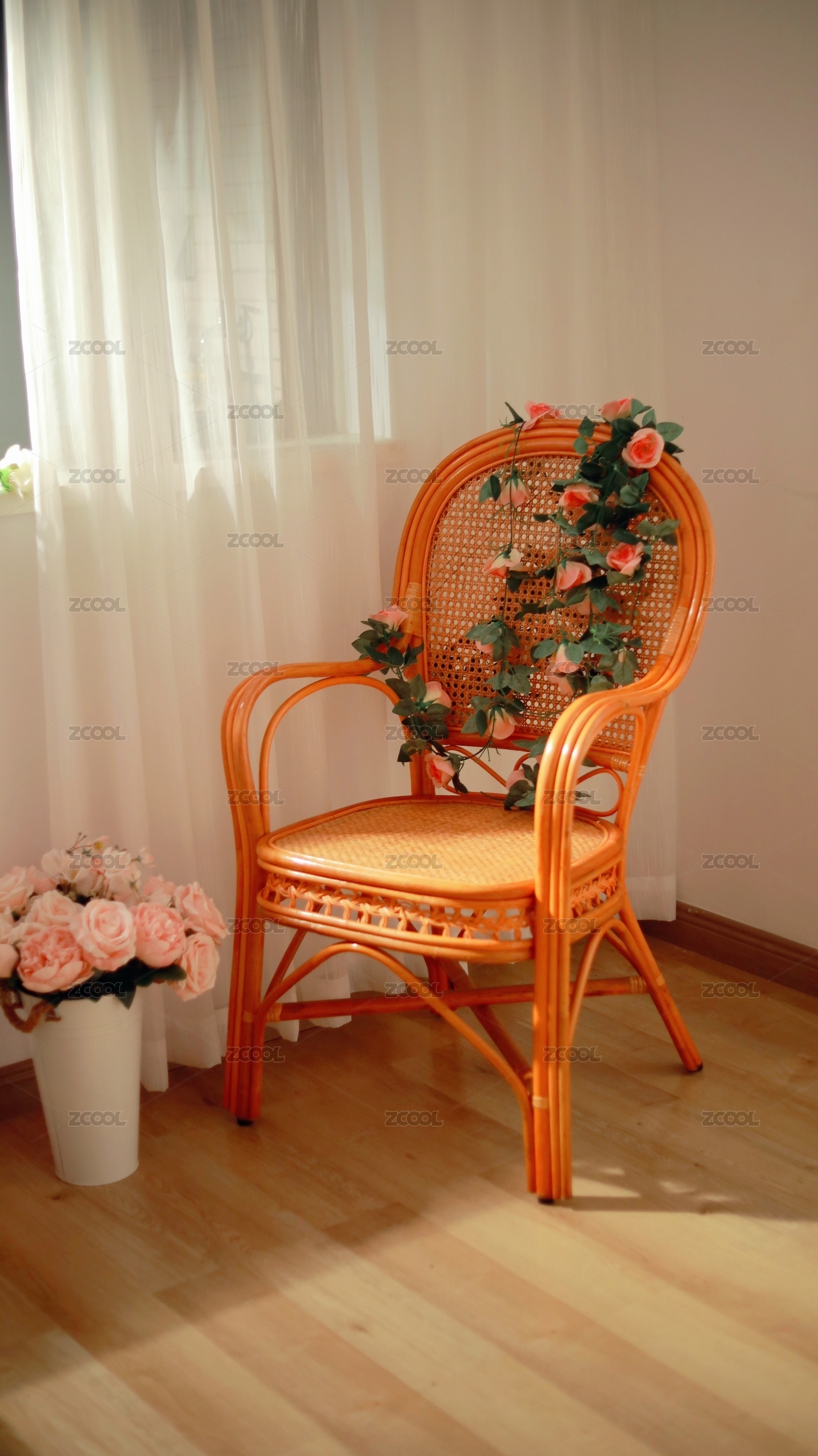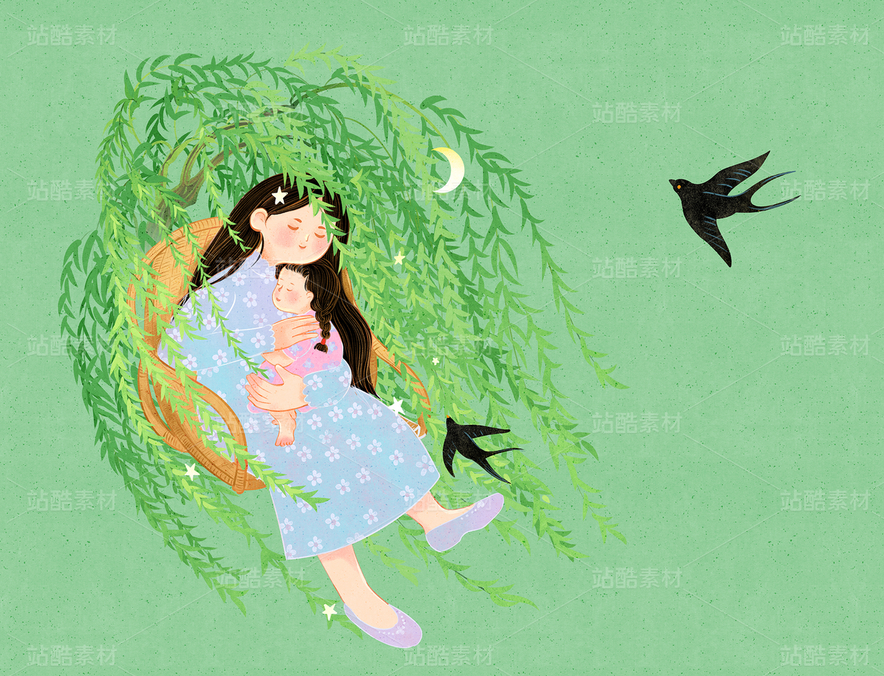 妈妈抱着女儿坐在藤椅上柳树燕子春天温馨插画