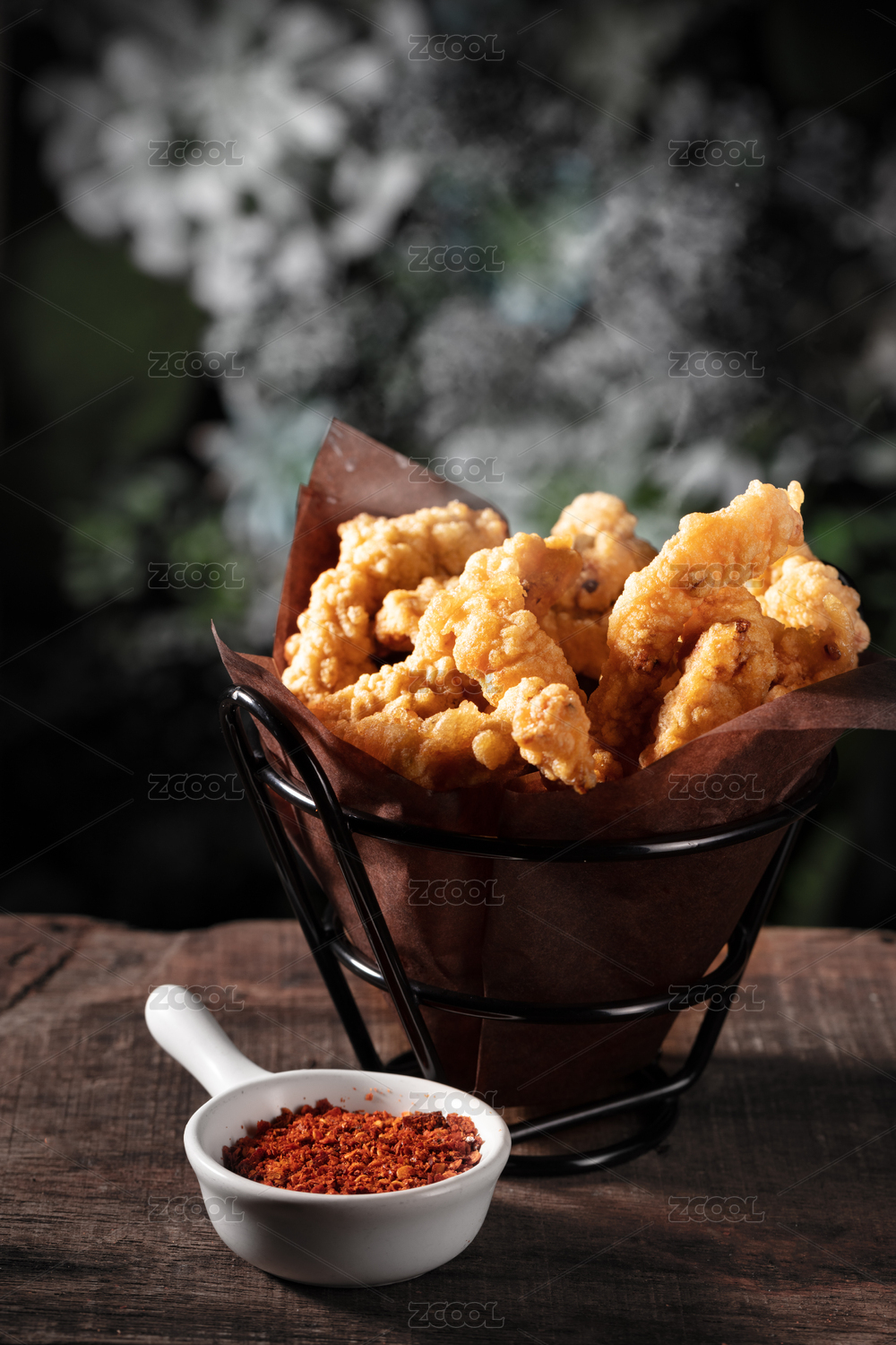 锥形铁架碗上纸包着的油炸酥肉