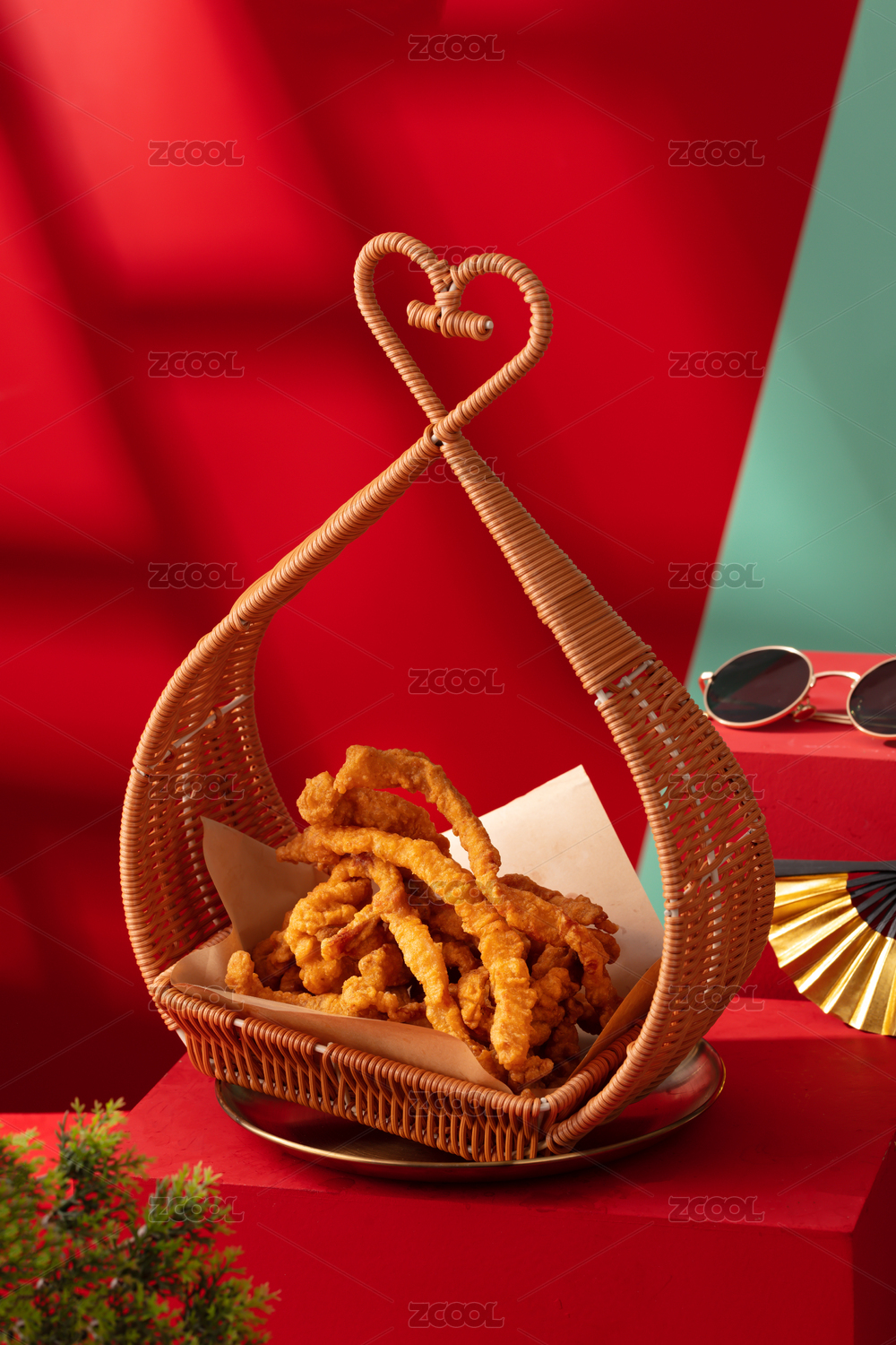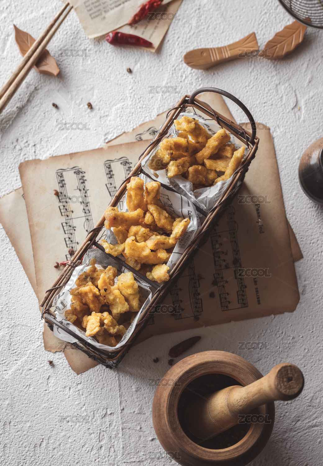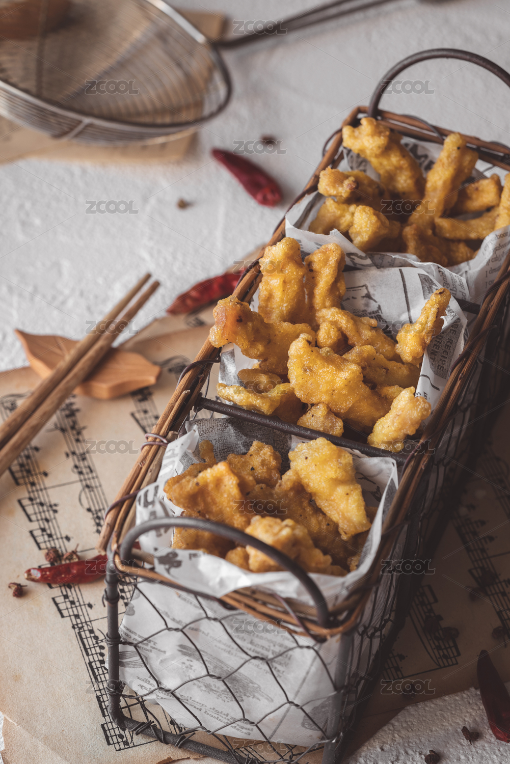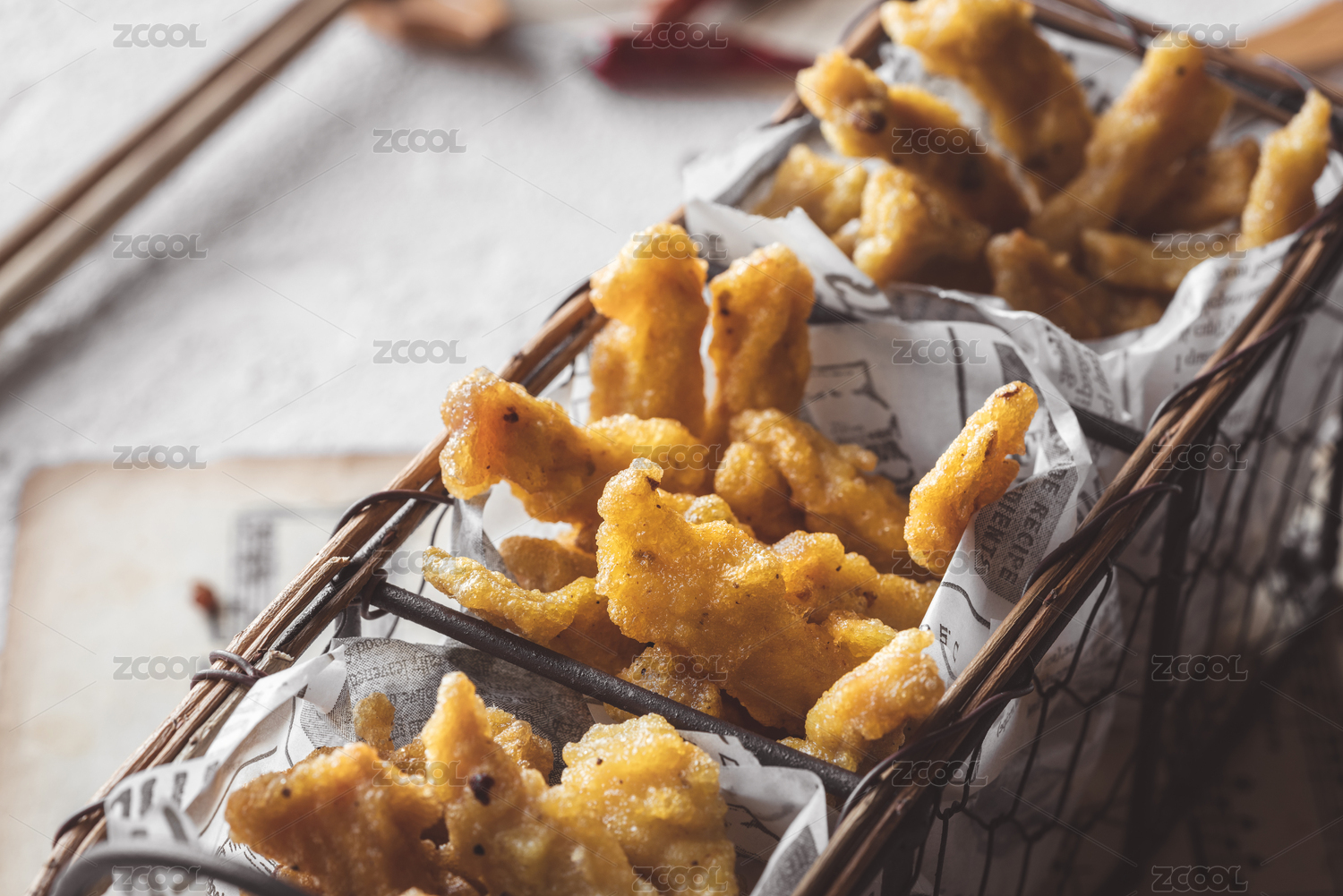 火锅小吃油炸食品篮子里炸酥肉条