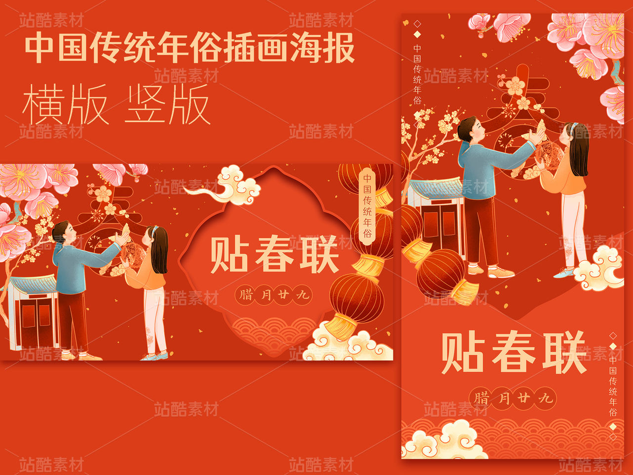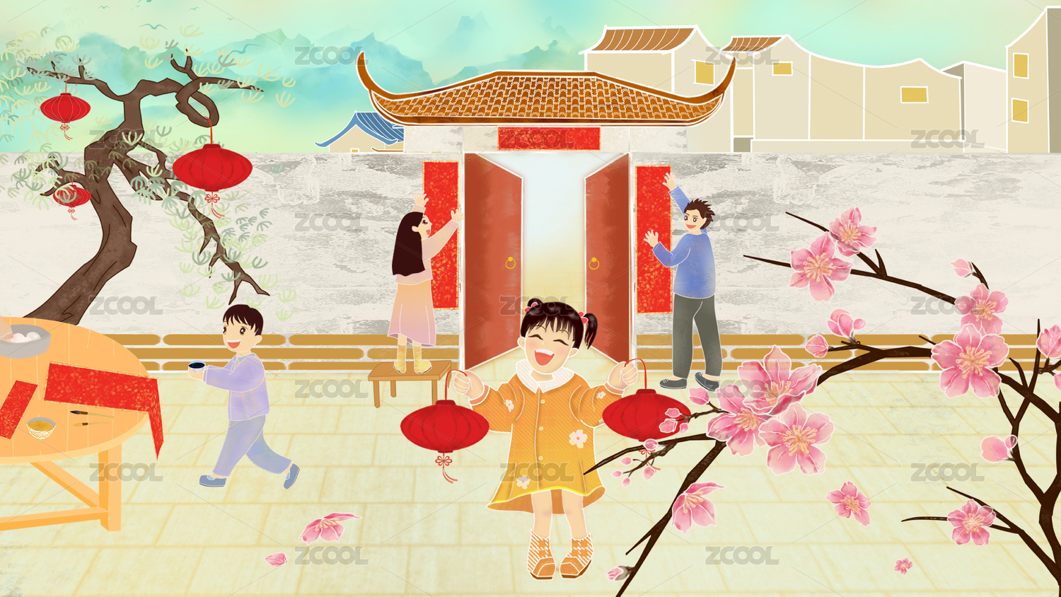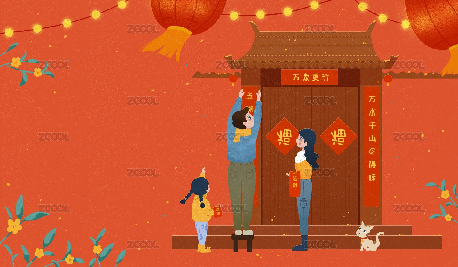 与家人一起贴春联 春节年俗插画 横版