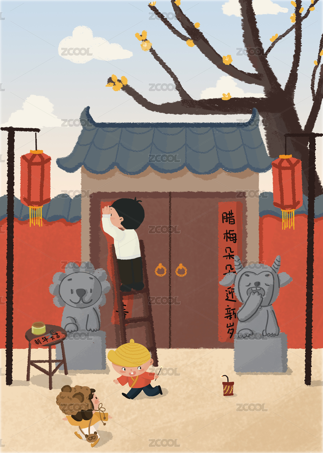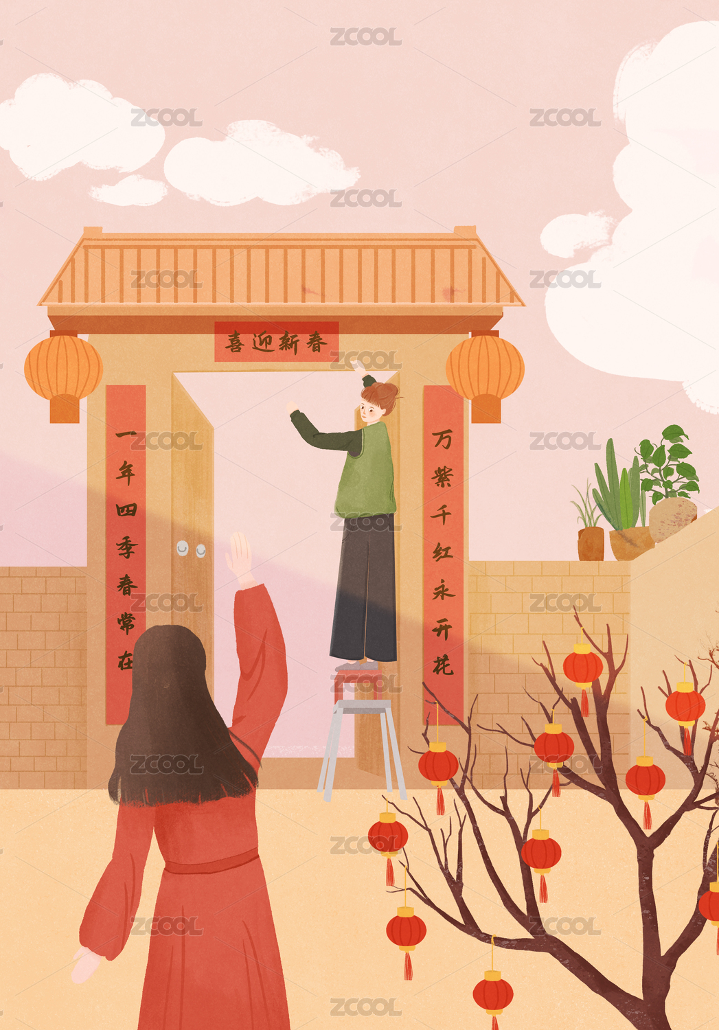 春节过年贴春联可爱的卡通形象节日气氛