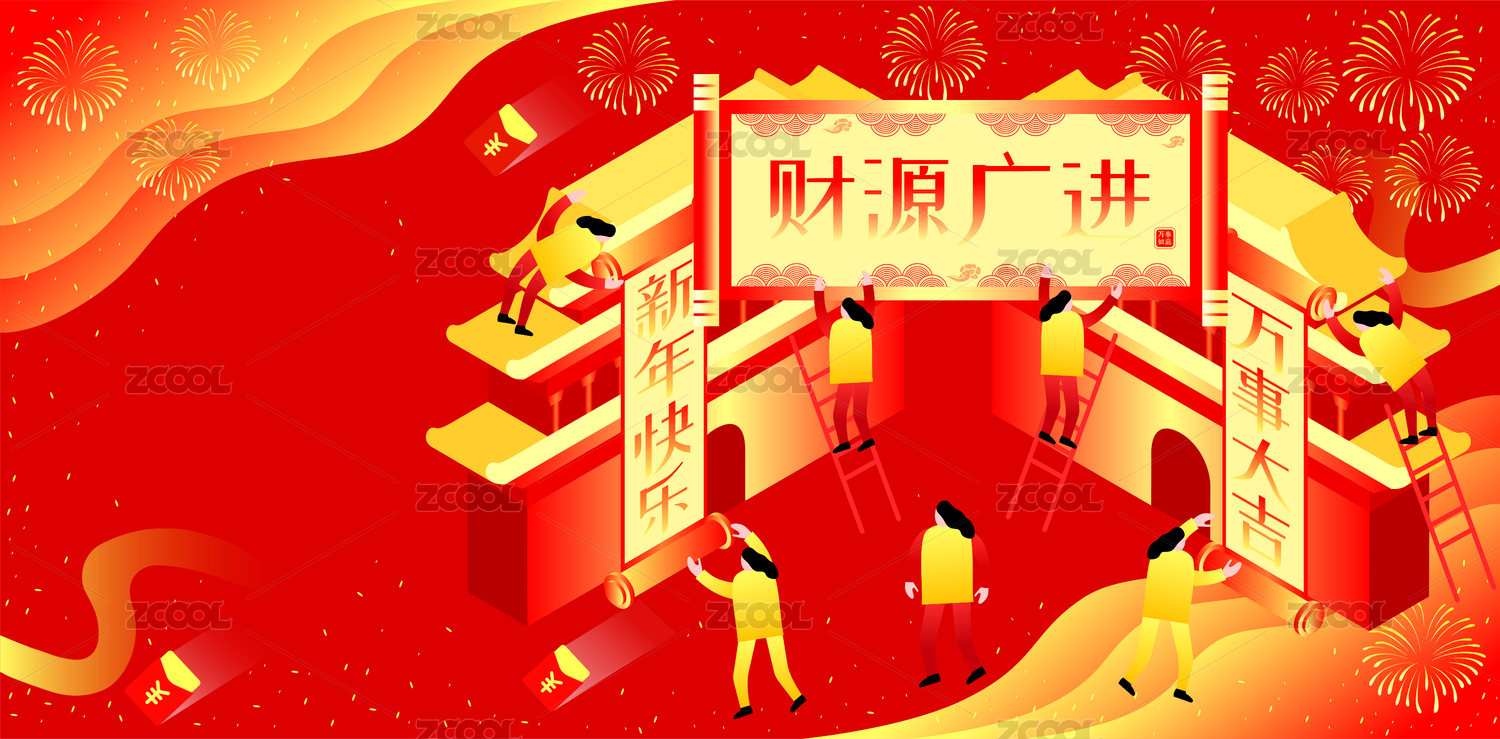 春节贴春联2.5D矢量插画