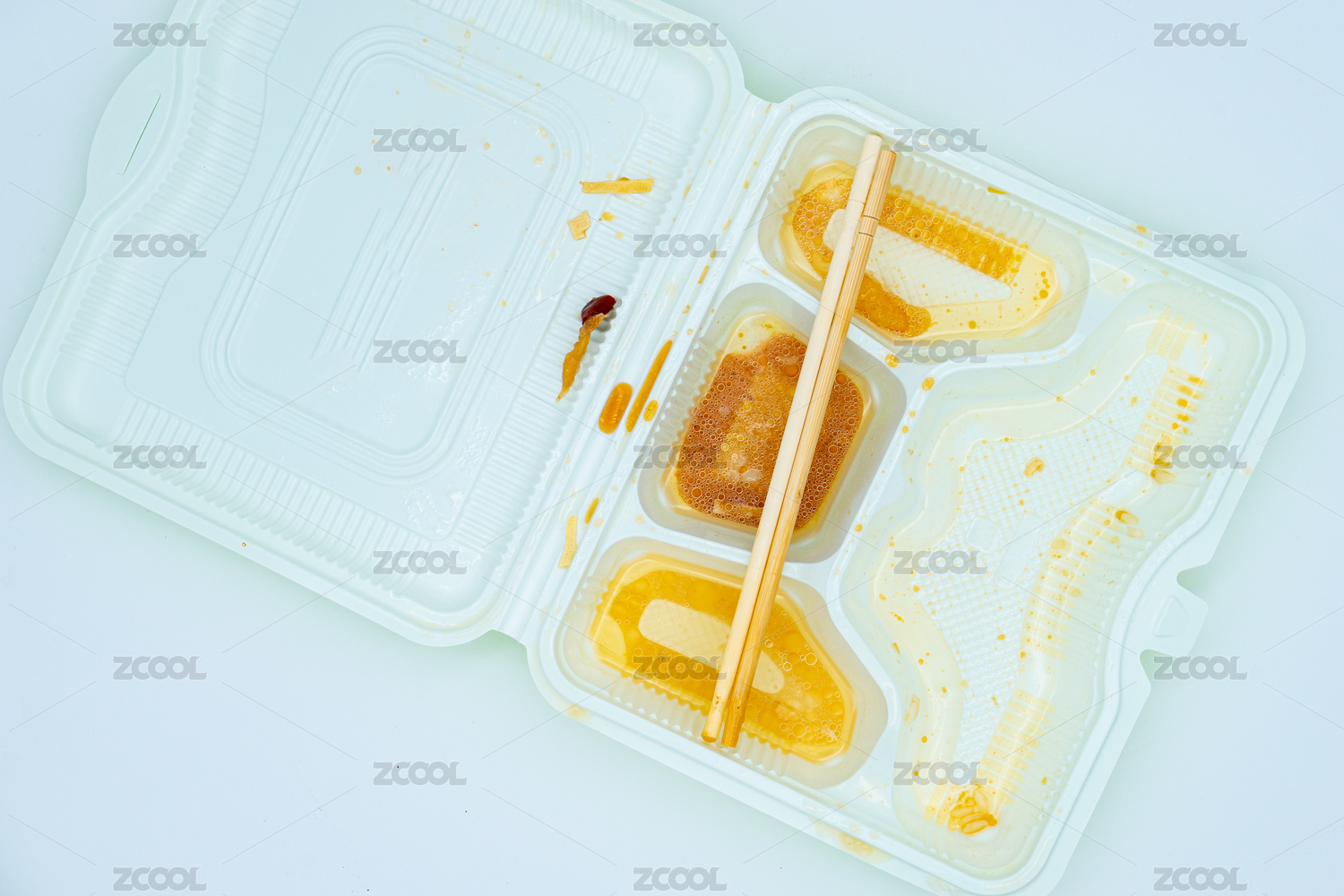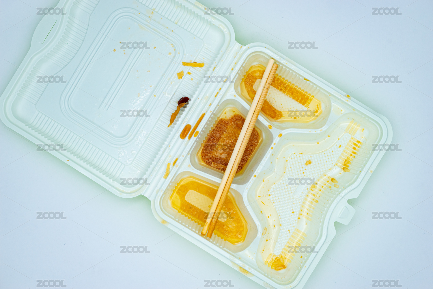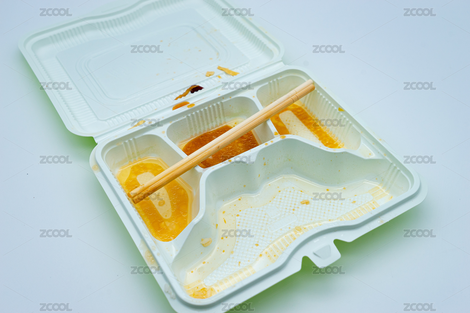 一个满是油污的白色饭盒和筷子