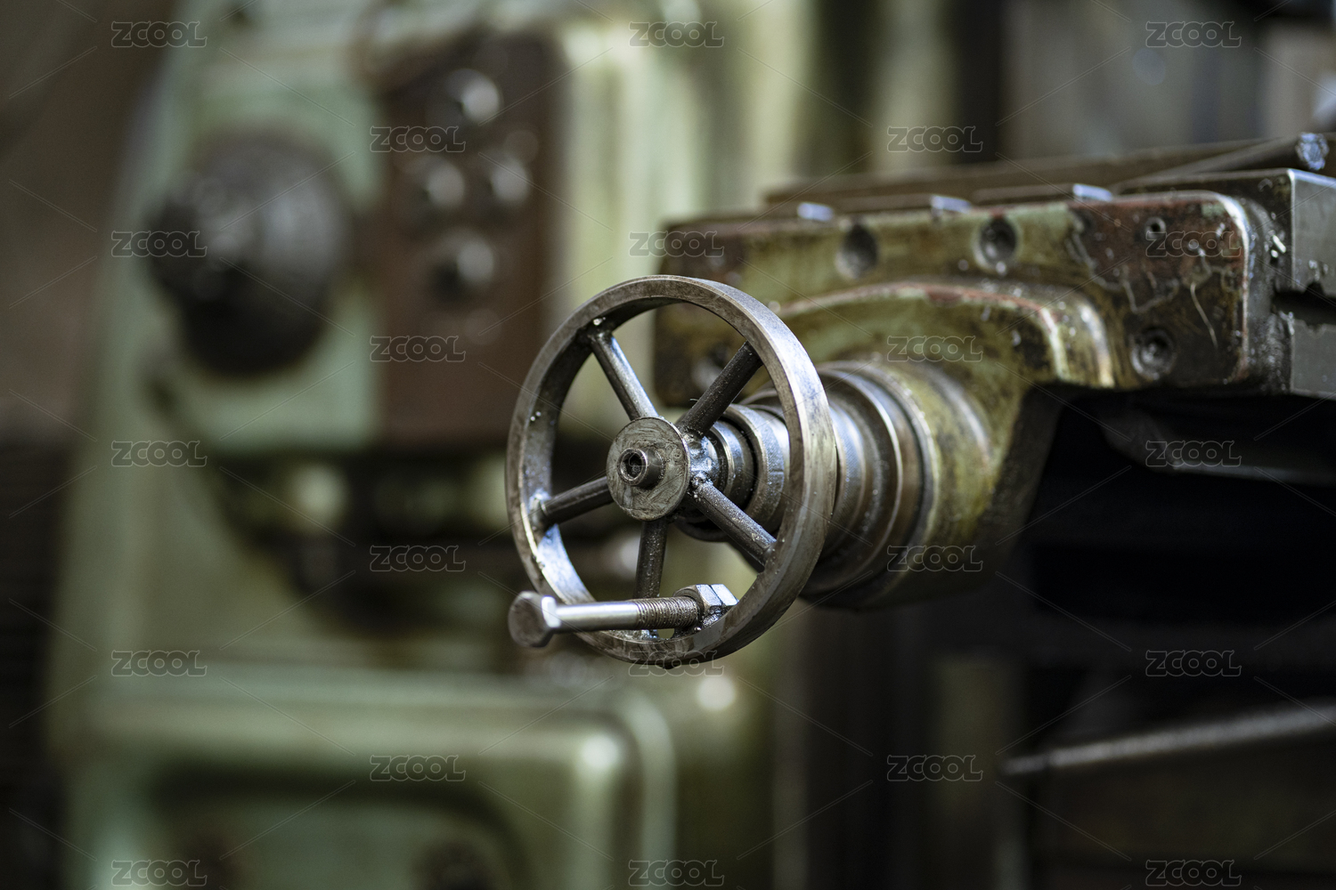 加工厂车床上一个沾满油污的旋钮特写