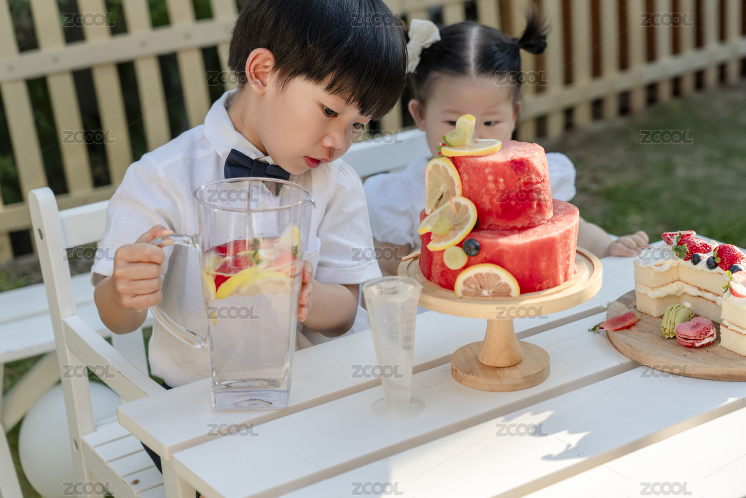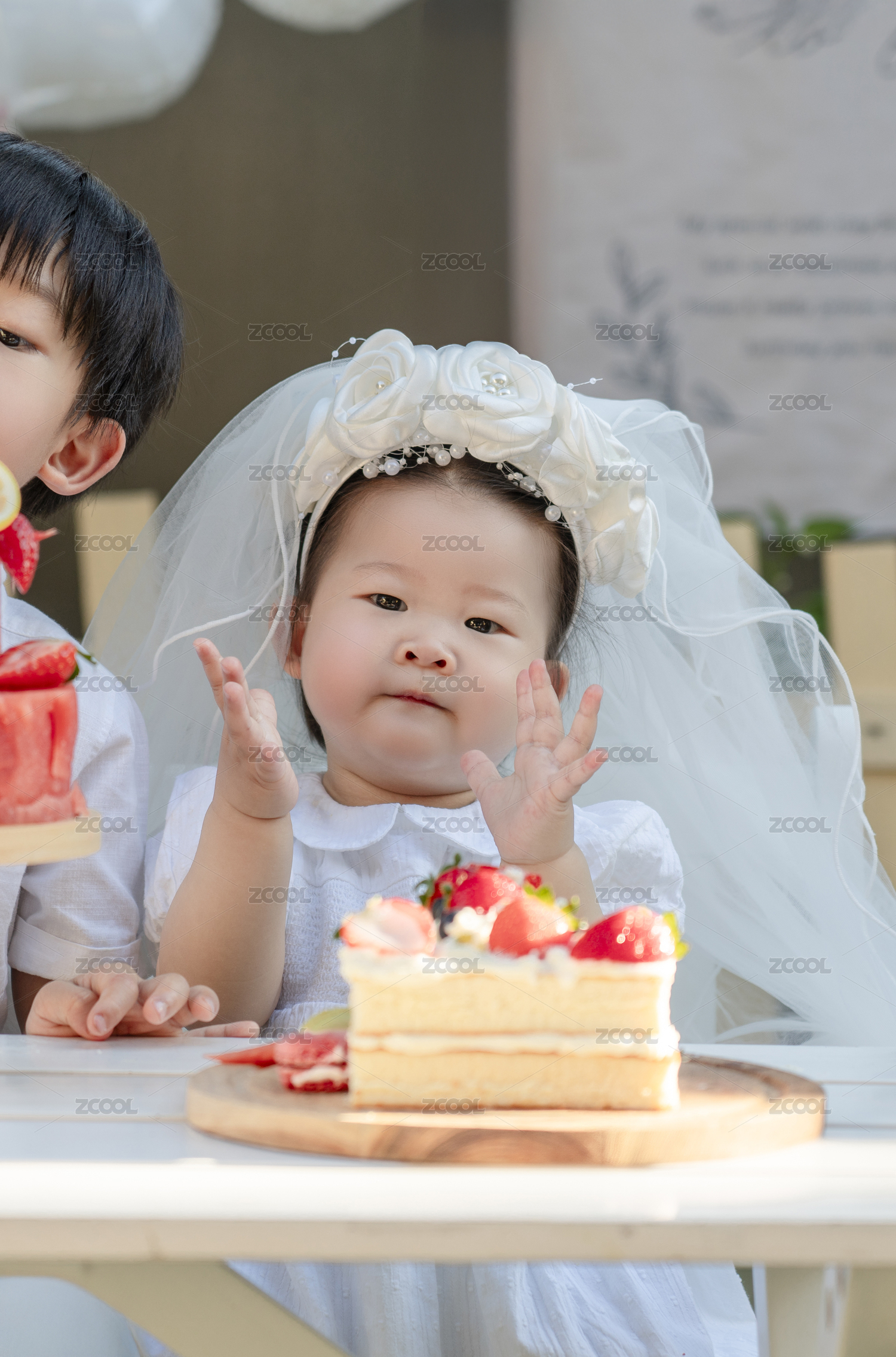 花园里小男孩与一周岁女孩一起分享生日蛋糕