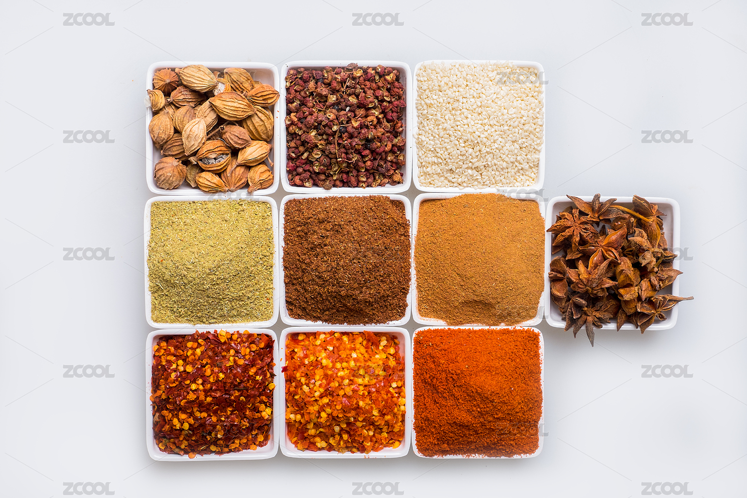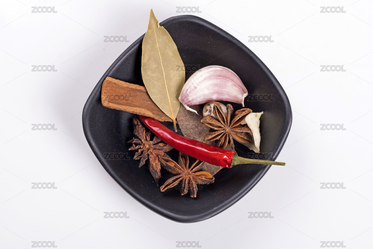 一盘中餐常用香辣烹饪调料香料,桂皮和香叶特写