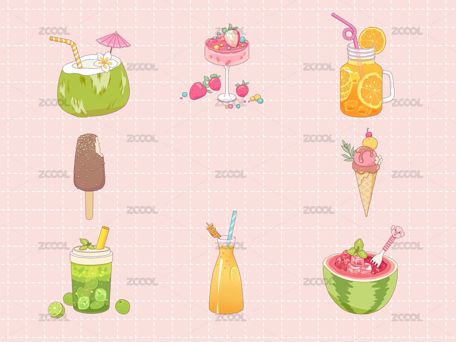 手绘夏天水果冷饮果汁雪糕冰淇淋等食品合集