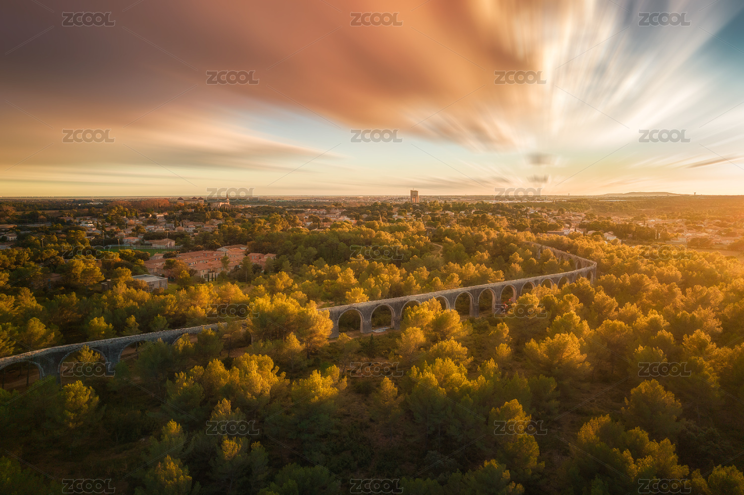 航拍古罗马水渠和森林公园黄昏风景