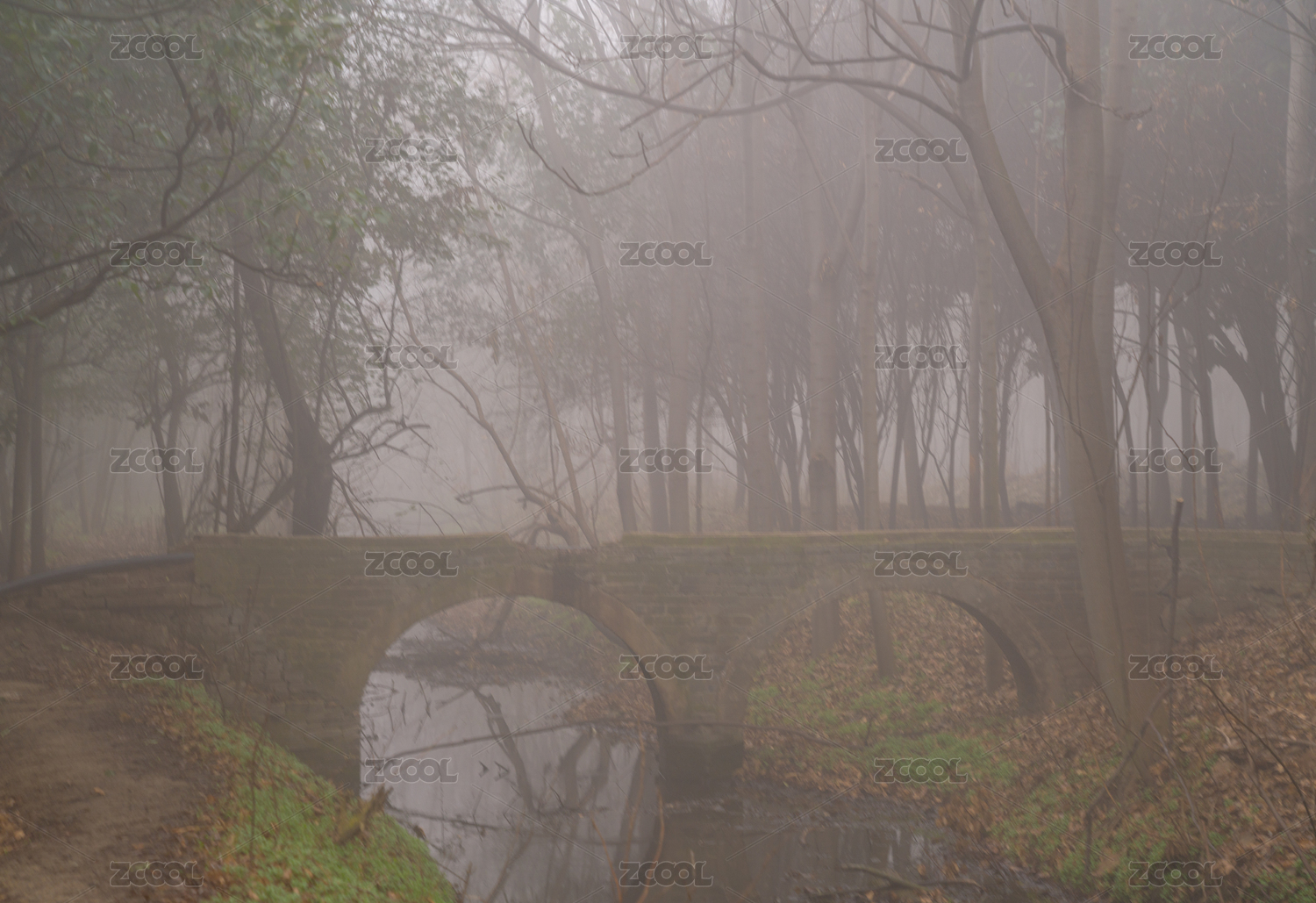 大雾弥漫的树林里小河与已废弃的水渠