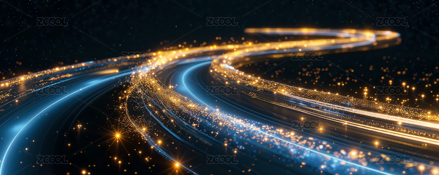 黑色背景上的金色光轨线条耀斑颗粒粒子壁纸