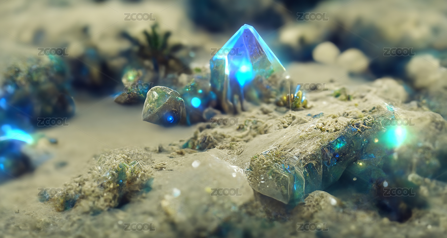 沙子上闪烁发光的梦幻蓝色宝石水晶微距插画