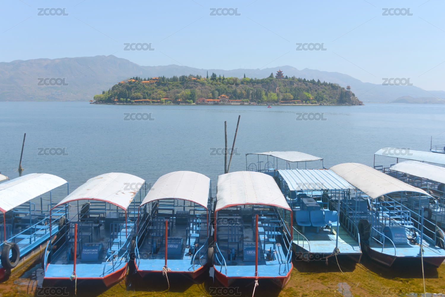 中国云南抚仙湖孤山风景名胜区岛屿及游船