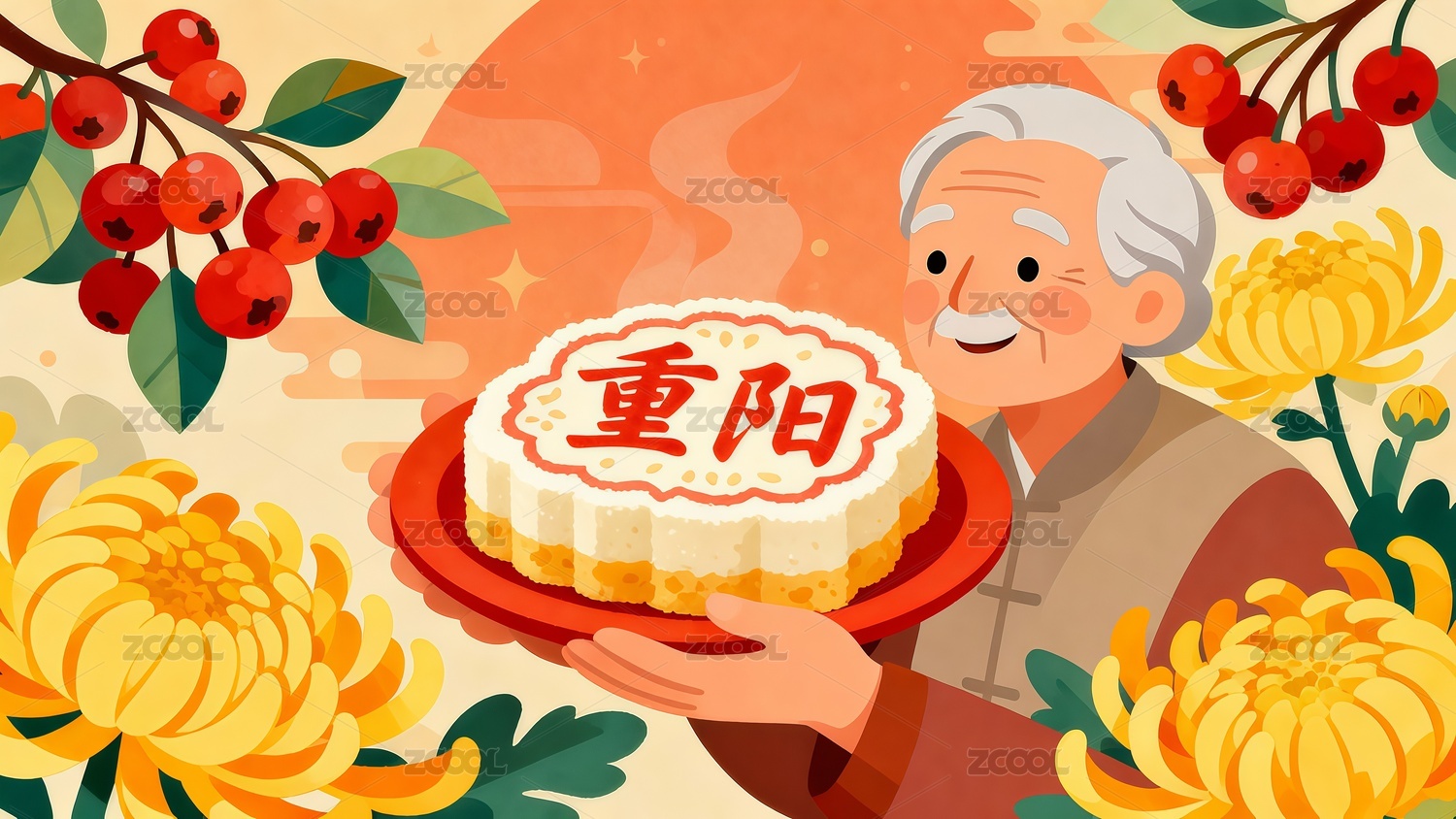 重阳节老年人手捧糕点手绘插画