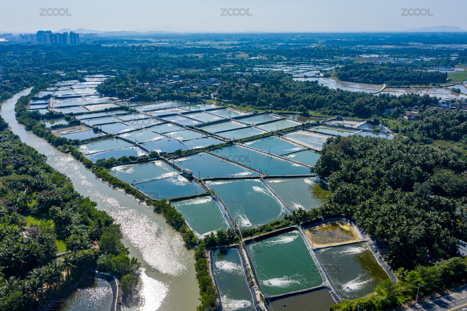 航拍海南琼海潭门镇沿海养殖场鱼塘虾塘密集